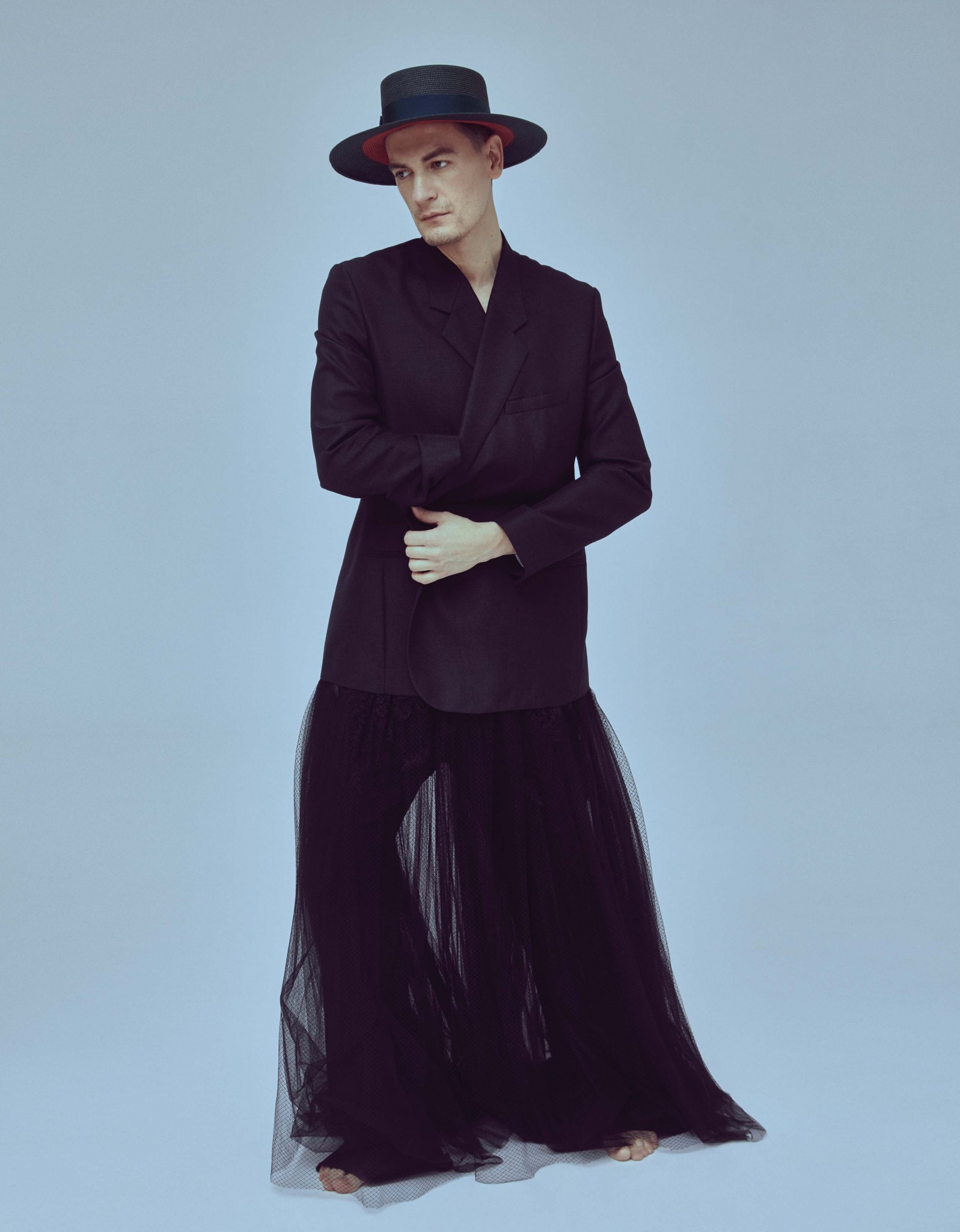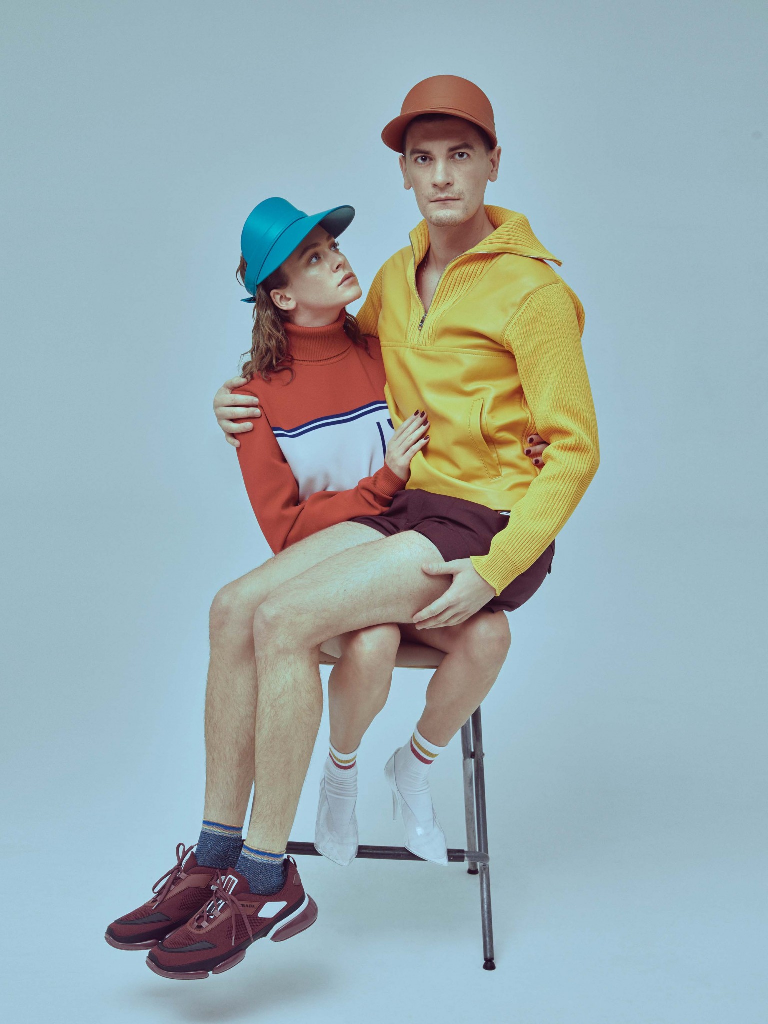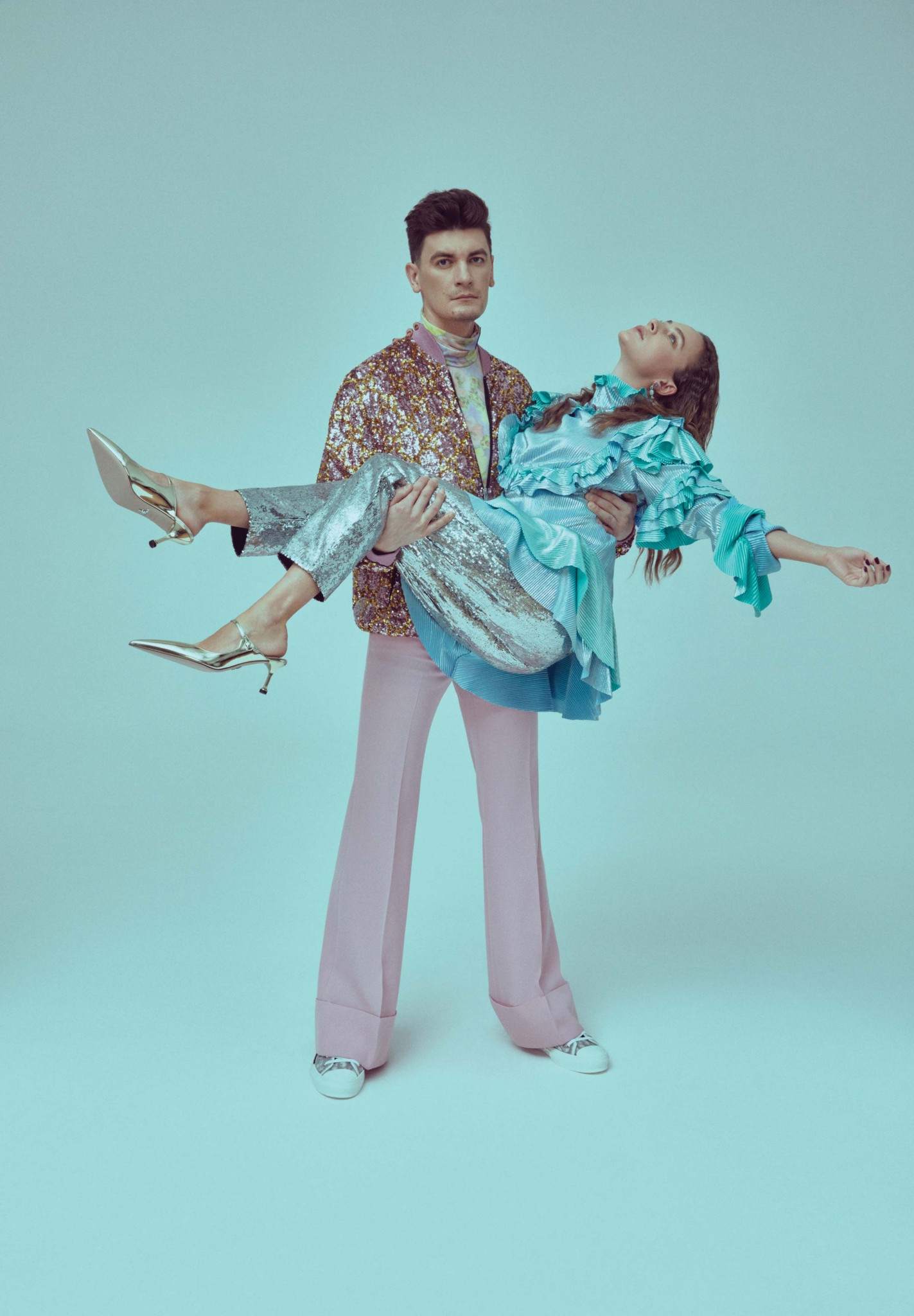 С тех пор лауреатка премии «Золотой орел» за лучшую женскую роль (в мелодраме «Лед», да!) и автор шоу «Вечерний Ургант», Comedy Woman и ютьюб-канала «Чикен Карри» (мы любим Сашу уже лет десять, еще капитаном команды КВН имени замечательного петербургского филолога и великого «знатока» Федора Двинятина) связали себя кинематографическими узами и теперь исполняют главные партии в нашем весеннем полиполовом фэшн-манифесте. В моде, заявляем мы, наступил гендерный коммунизм. Отныне, товарищи, в гардеробе все общее и его можно и нужно делить на двоих: и кружево, и юбки, и пайетки, и микрошорты, и колготки, и трусы, и усы. Хотя это не точно.