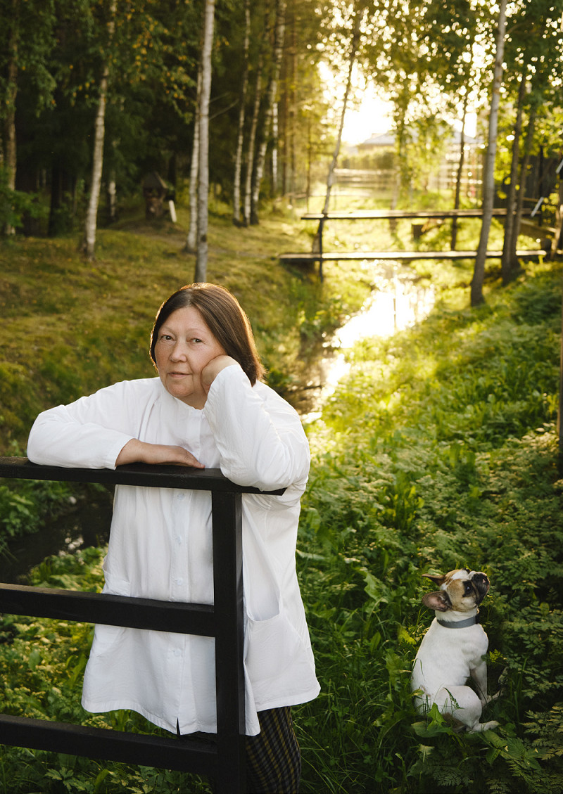 Этот дом построил сын Митя — и на Новый год вручил нам с мужем ключи. Дача стала нашей мастерской. Она небольшая, и мне это нравится: здесь я могу сосредоточиться на себе, здесь мы пишем картины и работаем в саду. В конце участка — чаща сосен и елей: растут сыроежки и лисички, течет ручей, пробегает рыжая лиса, истошно гудят и откладывают икру жабы. Прилетала утка — села в высокой траве, высидела яйца, вывела утят. Прилетали тучи бабочек — и были они всевозможных видов, будто Набоков проснулся и сам сюда их приволок. Целый месяц муж разгребал граблями в этой чащобе прошлогодние листья. А я посадила смородину, шиповник и желтый болотный ирис — думаю, уже следующим летом здесь заколосятся полевые цветы и травы.