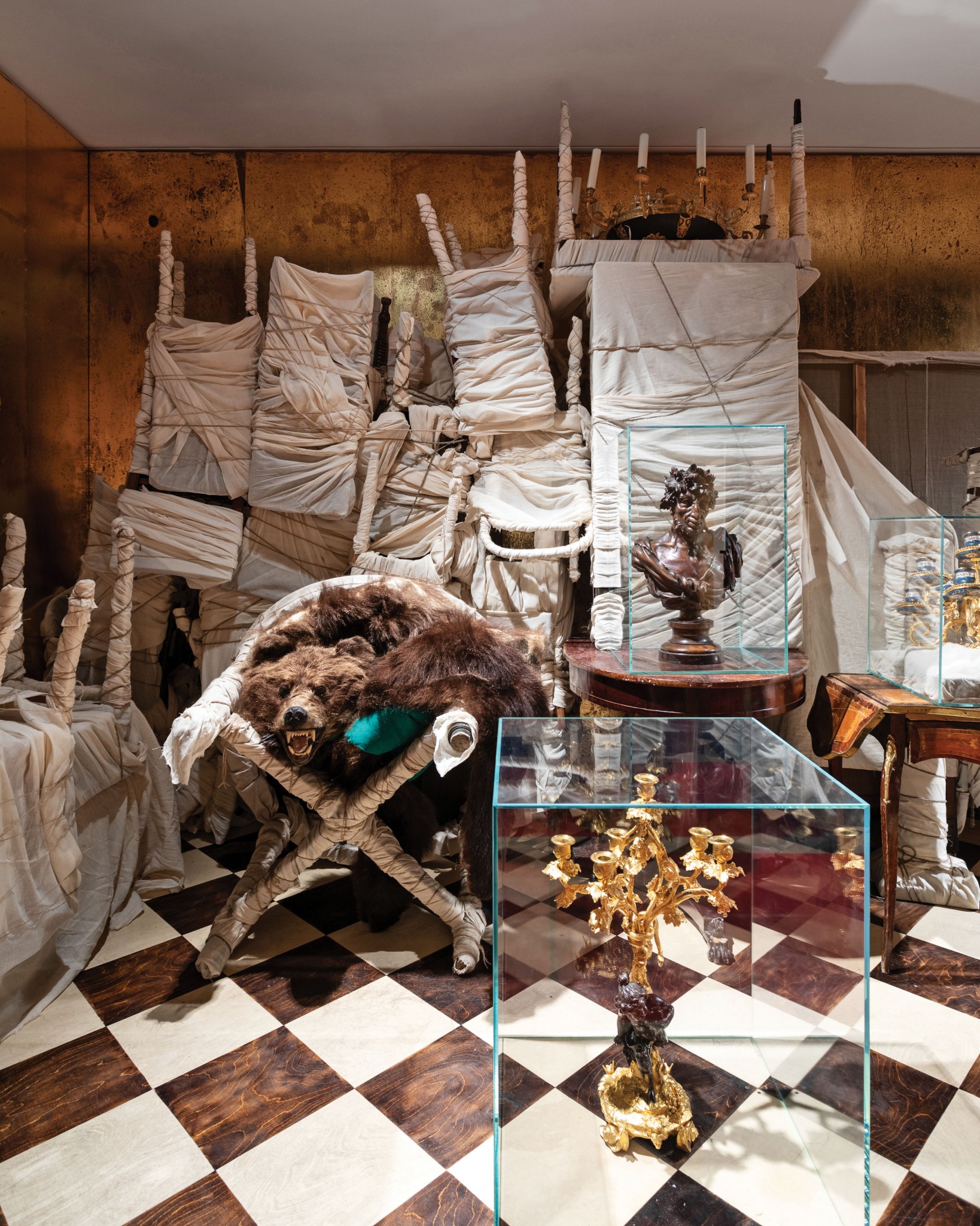 Очень помогло то, что незадолго до этого я работала над проектом Eternal Russia в берлинском театре Hebbel am Ufer — мы готовили его в 2017 году вместе с театральным критиком Мариной Давыдовой и композитором Владимиром Ранневым к 100-летию русской революции. Очень похожую тему я прорабатывала там с другой точки зрения: наш спектакль-инсталляция в Берлине про мутацию пространства, которое, меняясь, не меняется, про то, как правое кажется левым, а красное — серо-зеленым. Изучив события революции, я стала гораздо легче ориентироваться в том, что происходило в пригородных резиденциях в 1918 году и в следующие 100 лет.