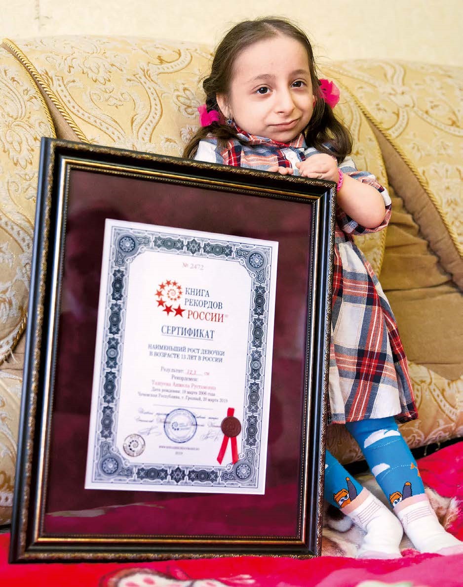Рост тринадцатилетней Анжелы Ташуевой – всего 72 сантиметра. Она страдает редким генетическим заболеванием – синдромом Секкеля (врожденная карликовость). Недавно помимо родного Грозного о малышке узнала вся страна: Ташуева попала в Книгу рекордов России. Малышка покорила всех не только своей особенностью, но и любовью к жизни.