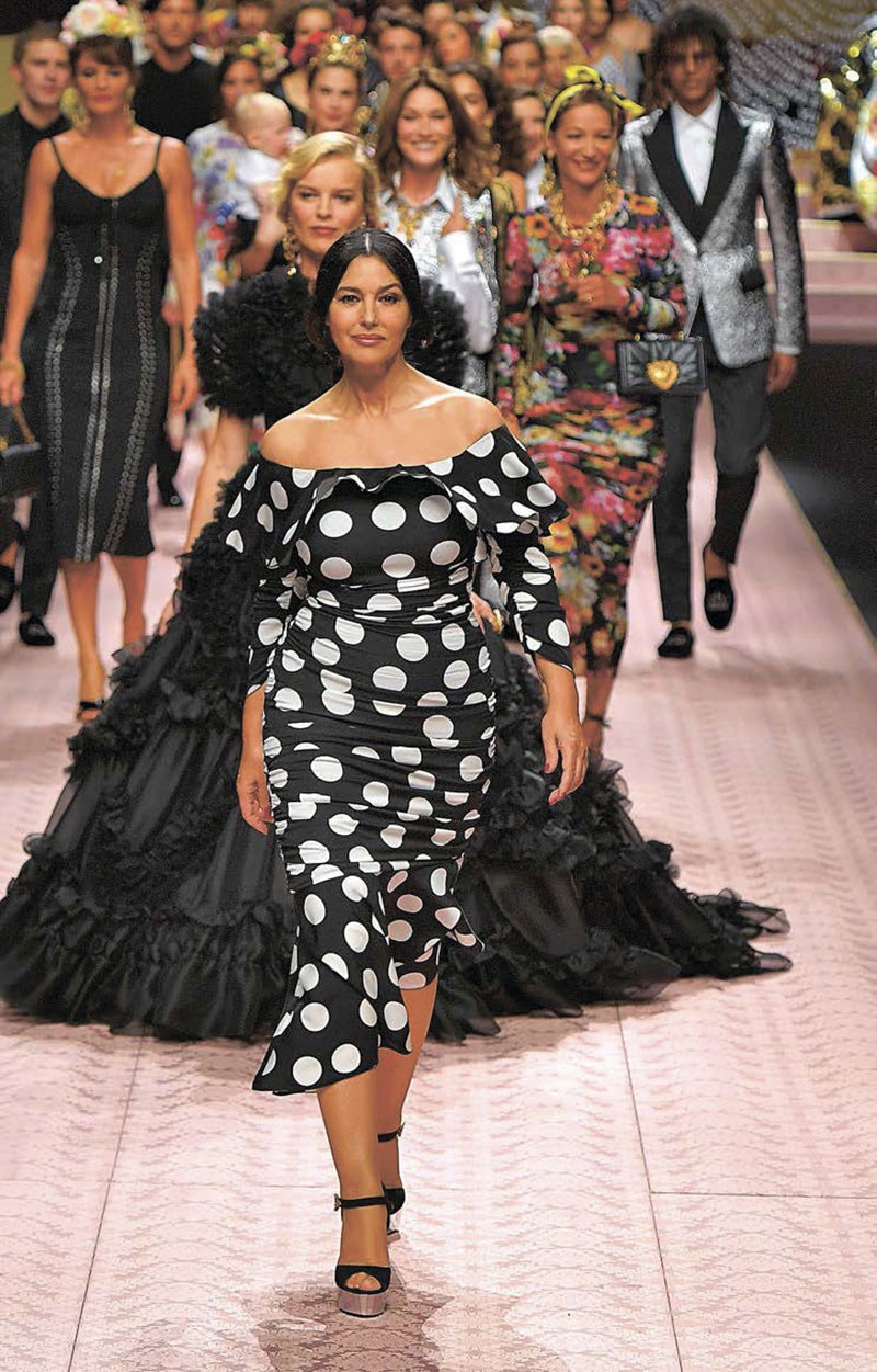 «А я иду такая вся в Дольче Габбана, я иду такая вся – на сердце рана…» Любой, даже Монике Беллуччи, наверное, нелегко наблюдать, как ее бывший счастлив в новых отношениях. 53-летняя актриса приняла участие в показе бренда Dolce & Gabbana. Она появилась на подиуме в черном облегающем платье в крупный горох. Тут уже пришла очередь Венсана Касселя шумно вздохнуть.