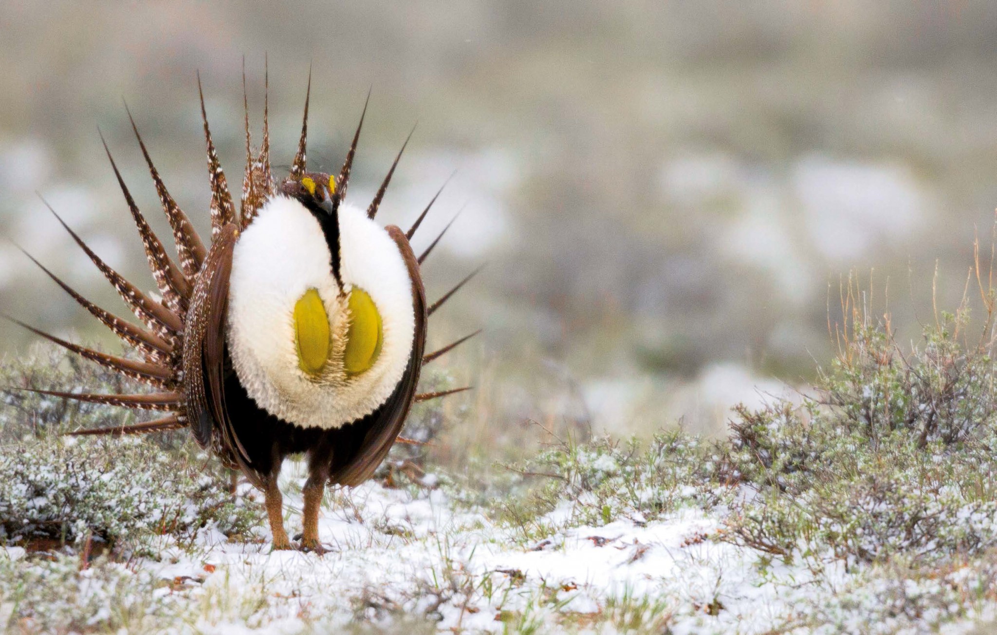 Вообще, эти птицы ни больше ни меньше – символ Дикого Запада. Самец так «принарядился» для поиска пары, ведь в марте начинается брачный период. Каждое утро пернатые собираются на токах – площадках посреди полынной прерии.