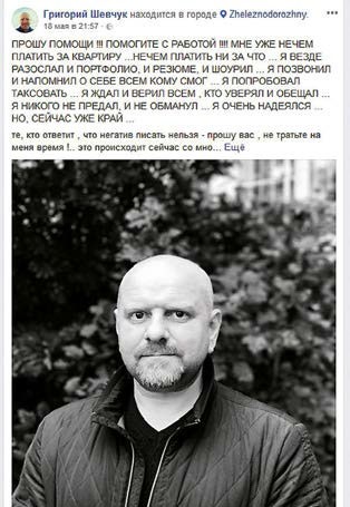 Уже девять месяцев Григорий Шевчук, единственный кормилец в семье с тремя детьми, не может найти постоянное место и перебивается случайными заработками. Абсолютное отчаяние охватило телезвезду в конце мая, когда он опубликовал пост в Фейсбуке (соцсеть признана в РФ экстремистской и запрещена): «Помогите! Мне уже нечем платить за квартиру… нечем платить ни за что. Я везде разослал и портфолио, и резюме. Позвонил и напомнил о себе всем, кому смог... Очень надеялся, но сейчас уже край».