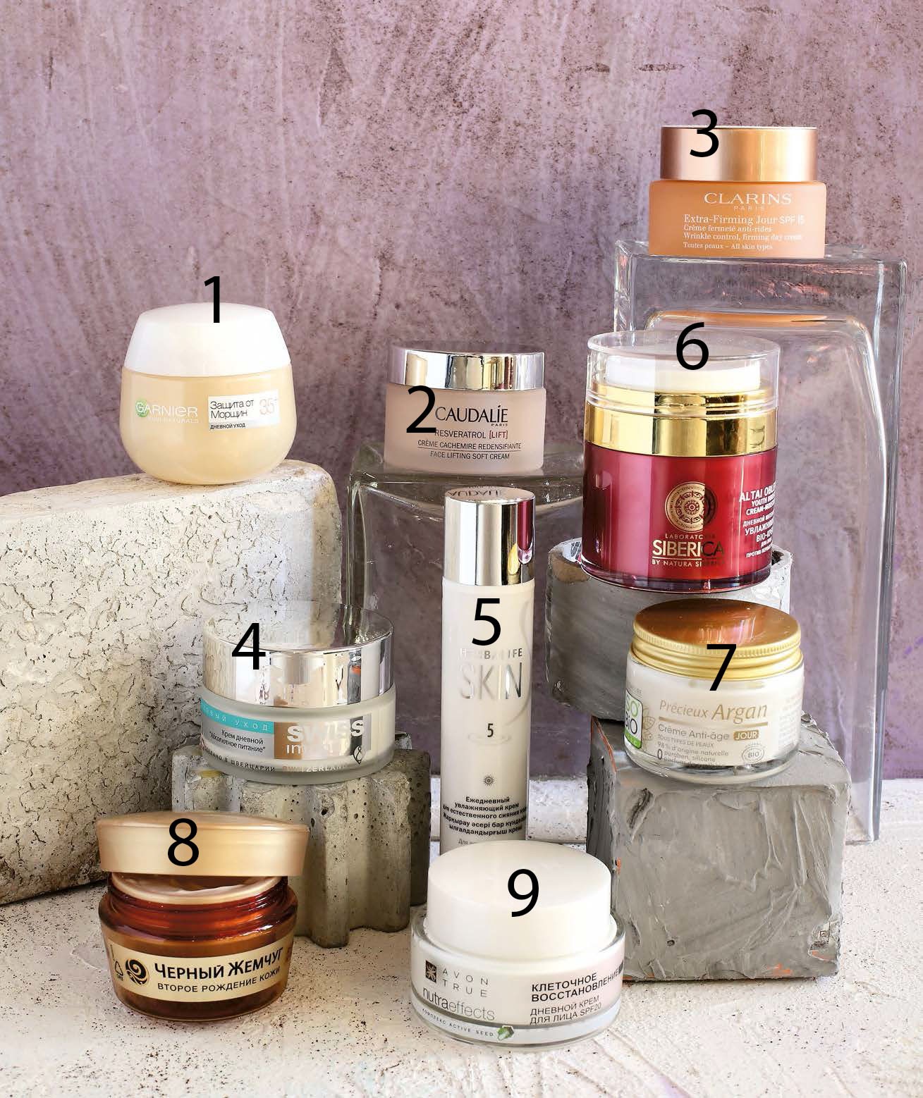 Дневные. 1. Garnier Уход «Защита от морщин» 35+, 220 руб. 2. Caudalie Крем-кашемир с эффектом лифтинга Resveratrol Lift, 3600 руб. 3. Clarins Регенерирующий дневной крем против морщин ExtraFirming, 6500 руб. 4. Swiss Image Крем дневной «Абсолютное питание», 300 руб. 5. Herbalife Skin Ежедневный увлажняющий крем для естественного сияния кожи, 2330 руб. 6. Natura Siberica Дневной интенсивный увлажняющий bio-крем Altai Oblepikha, 840 руб. 7. SO’BiO etic Дневной омолаживающий крем «Драгоценная аргана», 1210 руб. 8. «Черный жемчуг» Дневной крем «Второе рождение кожи», 186 руб. 9. Avon Дневной крем NutraEffects «Клеточное восстановление» 35+, 260 руб.