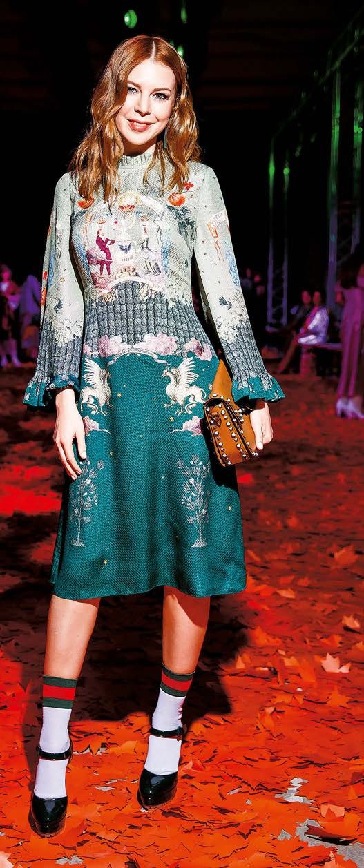 «Может показаться, что Наташа собралась на дискотеку в деревне. Но мне образ нравится: смело, свежо, стильно. Сумка – как самостоятельный элемент, носки Gucci идеально вписались в концепцию, а главное, прекрасное сочетание цвета и фактуры».