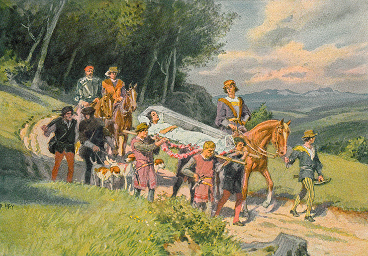После нескольких попыток убийства мачехе удается отравить Белоснежку яблоком. В известных нам сказке и мультфильме принц будит девушку прощальным поцелуем. В предыдущей редакции всё было суровее: королевич уломал гномов отдать ему тело девушки в хрустальном гробу — она была диво как хороша, и выглядела не мертвой, а спящей.