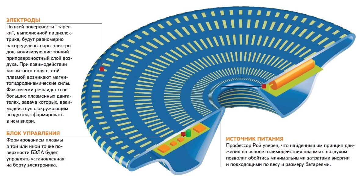 По-настоящему революционным можно назвать принцип движения БЭЛА — аппарат будет держаться и перемещаться в воздухе благодаря плазме. Эта идея возникла в голове автора проекта не спонтанно — к моменту подачи патента у профессора Роя уже накопился солидный список научных публикаций по теме взаимодействия приповерхностного слоя плазмы с обтекающим потоком воздуха. Интерес к подобным исследованиям давно существует у аэрокосмической промышленности, так как слой плазмы на поверхности летательного аппарата рассматривается как возможность улучшения его аэродинамических свойств. Военные также рассматривают это явление как возможность скрыть объект от радаров противника. Кстати, именно это свойство ионизированного газа пытались использовать советские конструкторы, разработавшие в 80-е годы прошлого века гиперзвуковую крылатую ракету «Метеорит» с установленным на борту специальным плазменным генератором.