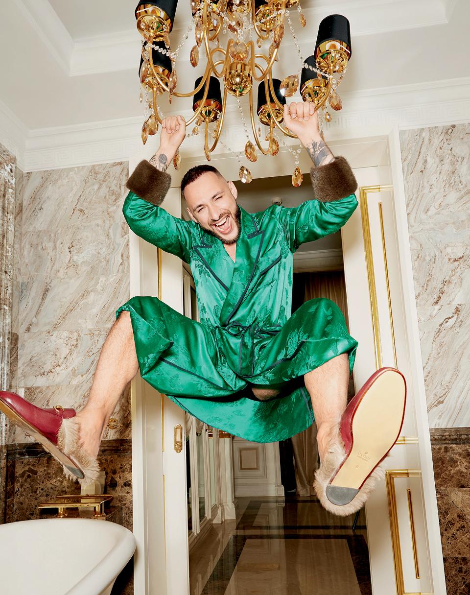 Шелковый халат с отделкой из меха норки, слиперы из кожи и меха кенгуру, все Gucci; хлопковые трусы, Intimissimi.