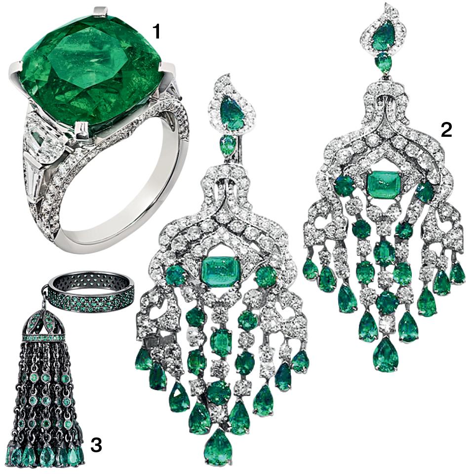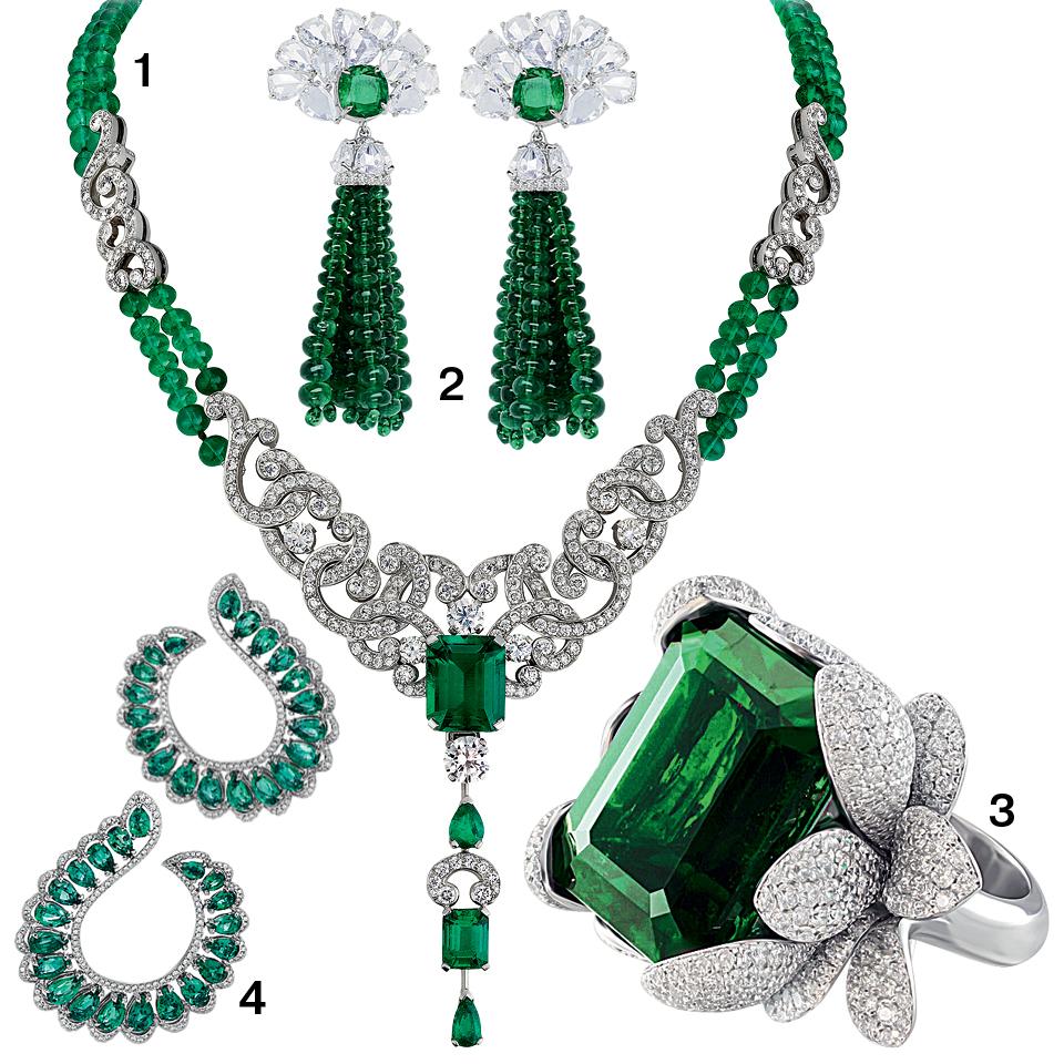 Все украшения из белого золота с изумрудами и бриллиантами.