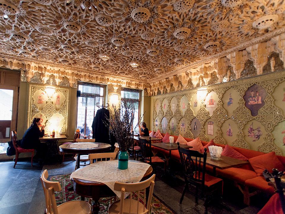 Человек, который приезжает в Грузию, он ведь чего хочет? Наверное, он хочет поесть. Летел ради персиков, а на месте аппетит у него растет — и поесть он хочет, конечно же, хачапури, хинкали и все остальное грузинское. Я его сразу веду к Резо Габриадзе. При его Театре марионеток (Иоане Шавтели, 13) есть кафе, где хорошо сидеть небольшой компанией. Меню там с трогательными комментариями — вроде «мчади, замешанные в думах». У Габриадзе кукурузные лепешки мчади красивые, с мягким сыром — идеальная закуска под аперитив. Его семья живет в том же доме, так что в кафе можно встретить и Резо Левановича, и тбилисских художников, и ваших с ним общих знакомых, которых, поверьте, наберется немало. Совсем рядом там очень старое кафе «Лейла» (Иоане Шавтели, 18) — надо заглянуть хотя бы ради иранского потолка, зеркал и мозаик. Если вы любите ходить по древним церквям, то до базилики Анчисхати (Иоане Шавтели, 9) VI века рукой подать.