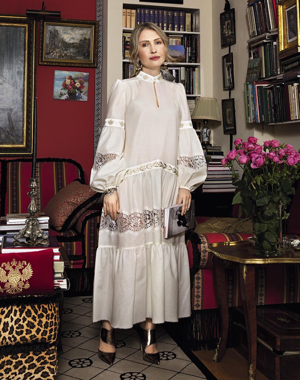 Горячий «эрл грей» льется в чашку конца сороковых годов. В конфетнице кузнецовского фарфора горкой лежат безе. Два массивных подсвечника так и просятся в сцену первого бала Наташи Ростовой. «Я сама их придумала: скомбинировала элементы разных канделябров начала XIX века, — объясняет Юлия. — Они из бронзы, покрыты двадцатичетырехкаратным золотом». Сама владелица и дизайнер марки Russmotive, воскрешающей искусство русской вышивки, одета сейчас в домашний костюм, расшитый золотыми пчелами. Волосы уложены небрежной волной, на щеках естественный румянец.