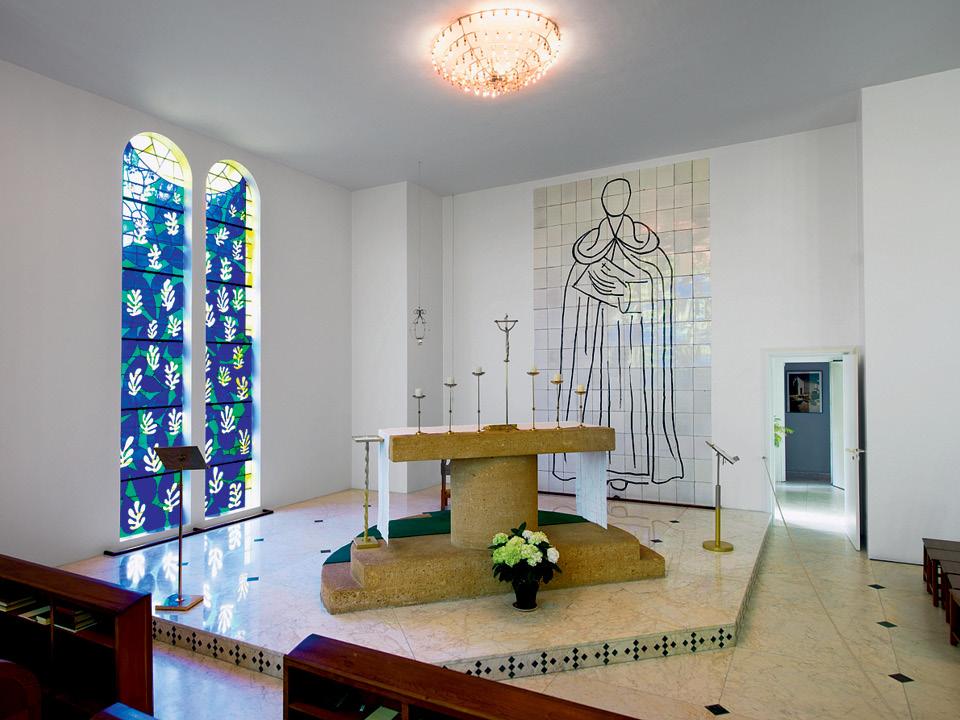 Художник прикоснулся ко всему: произвел витражи и керамические фрески, сине-белые узоры на крыше, распятие из позолоченной бронзы и подсвечники на алтаре, вход в исповедальню. Используя простую цветовую гамму ультрамаринового, зеленого и желтого, Матисс создал причудливый узор — из стен как бы вырастают листья. Прикованный к креслу после тяжелейшей операции в начале сороковых, мастер был вынужден отказаться от живописи на холсте и тем более на стенах. Он создал стиль «нарезок из бумаги»: вырезал