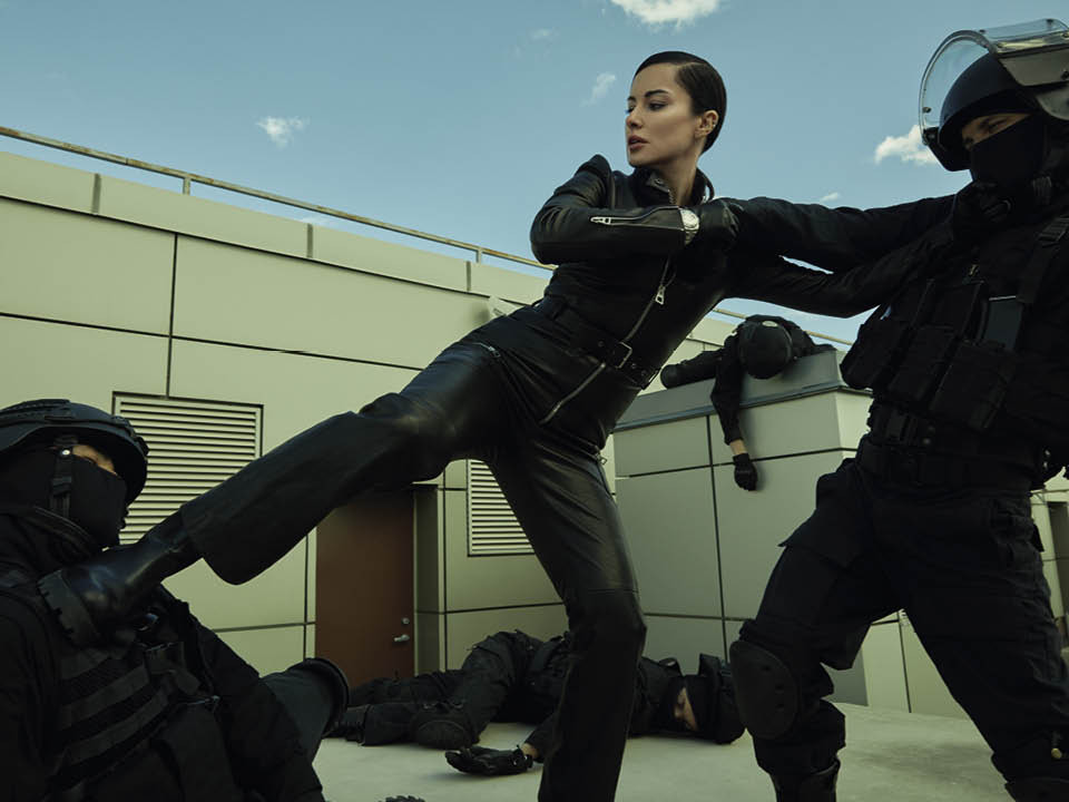 Мы спасаем человечество на пронизывающем осеннем ветру, на крыше отеля Crowne Plaza, откуда вся Москва как на ладони. Восемь часов подряд, прерываясь только на чай с «оранжевым бакинским лимоном», Тина беспрекословно выполняет команды фотографа. Дерется с каскадерами, косплеит кадр с мокрым стеклом, гоняет на «Ямахе». Прямо здесь же, на площадке, переодевается из «Боттеги» в «Тома Форда» (благо весь нынешний модный сезон по законам «Матрицы» состоит из темной кожи). Параллельно с нашей командой юноша Роман лет двадцати пилит для Тины тикток. Глаз-алмаз медиаменеджера несколько месяцев назад выхватил Романа из толпы во время посещения кузницы тикток-кадров, Dream Team House (отсюда вышел, например, Даня Милохин, звезда сентябрьской обложки GQ). Роман мечтает, разумеется, о большом кино, но пока снимает пятнадцатисекундные ролики для фабрики контента имени Тинатин Гивиевны Канделаки.