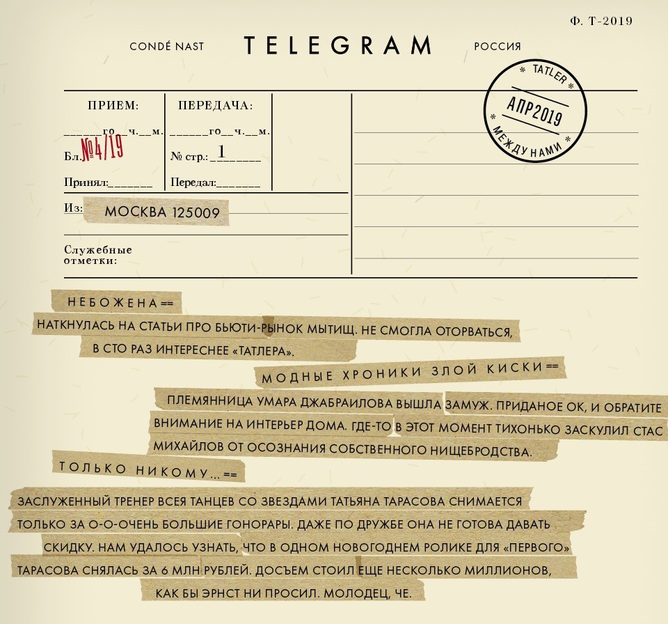 Для этого в телеграме есть свои силы зла. Что скрывать: герои «Татлера» нет-нет да и почитывают канал «Футляр от виолончели» с не всегда правдивыми «сливами». Там даже есть специальная рубрика #Tatler и термины «героиня #Tatler» и «герой #Tatler» (еще есть «чиновник-педофил» и «банкир-сексоголик»). Под хештеги, правда, попадают люди, на страницах журнала пока ни разу не бывавшие, — вроде членов Тамбовской ОПГ. «Tatler — это наша рубрика, — объясняет читателям администрация канала. — Критерии отбора героев схожи с форматом русского «Татлера», но не идентичны».