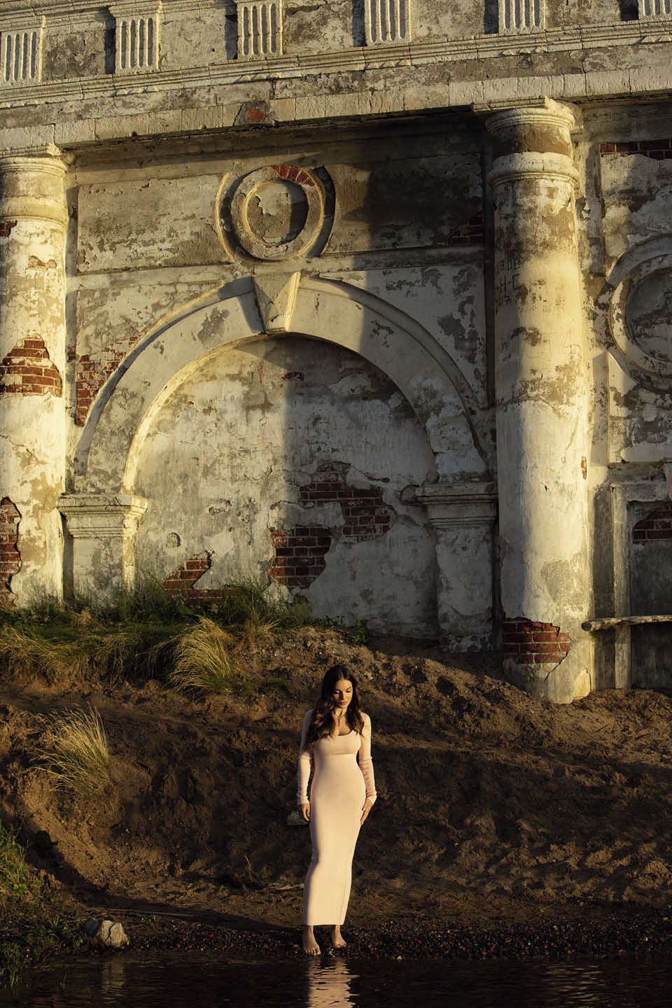 У колокольни Никольского собора в Калязине. Платье из вискозы и полиэстера, Wos; колье Sparkling Dance North с родиевым покрытием и покрытием оттенка розового золота и кристаллами, Swarovski.