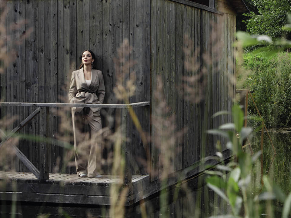 Руководитель Федерального агентства по туризму Зарина Догузова в усадьбе Домотканово Тверской области. Шерстяной костюм, кожаный пояс, Brunello Cucinelli; боди из нейлона и хлопка, Lavarice; кожаные сапоги, Wos; серьги Time с золотым и родиевым покрытием и кристаллами, Swarovski.