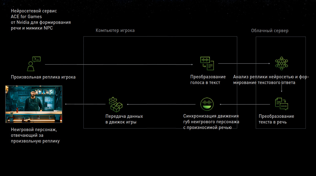 Потом эту текстовую импровизацию нужно трансформировать в речь, причем с соответствующей мимикой. Для этого существует нейросетевой сервис ACE for Games от Nvidia, который объединяет три оптимизированные базовые ИИ-модели. Первая, Nvidia NeMo, пишет реалистичную речь персонажа с учетом его истории. Обучают эту модель разработчики на собственных наборах данных. Вторая, Nvidia Omniverse Audio2Face, создает анимацию лица персонажа в соответствии с произносимой им речью. Этот модуль включает коннекторы Omniverse для MetaHuman Animator – программы лицевой анимации, работающей с популярным игровым движком Unreal Engine 5. И наконец, третья, Nvidia Riva, служит для распознавания речи игрока и трансформации ее в текст для общения с игровым ИИ.