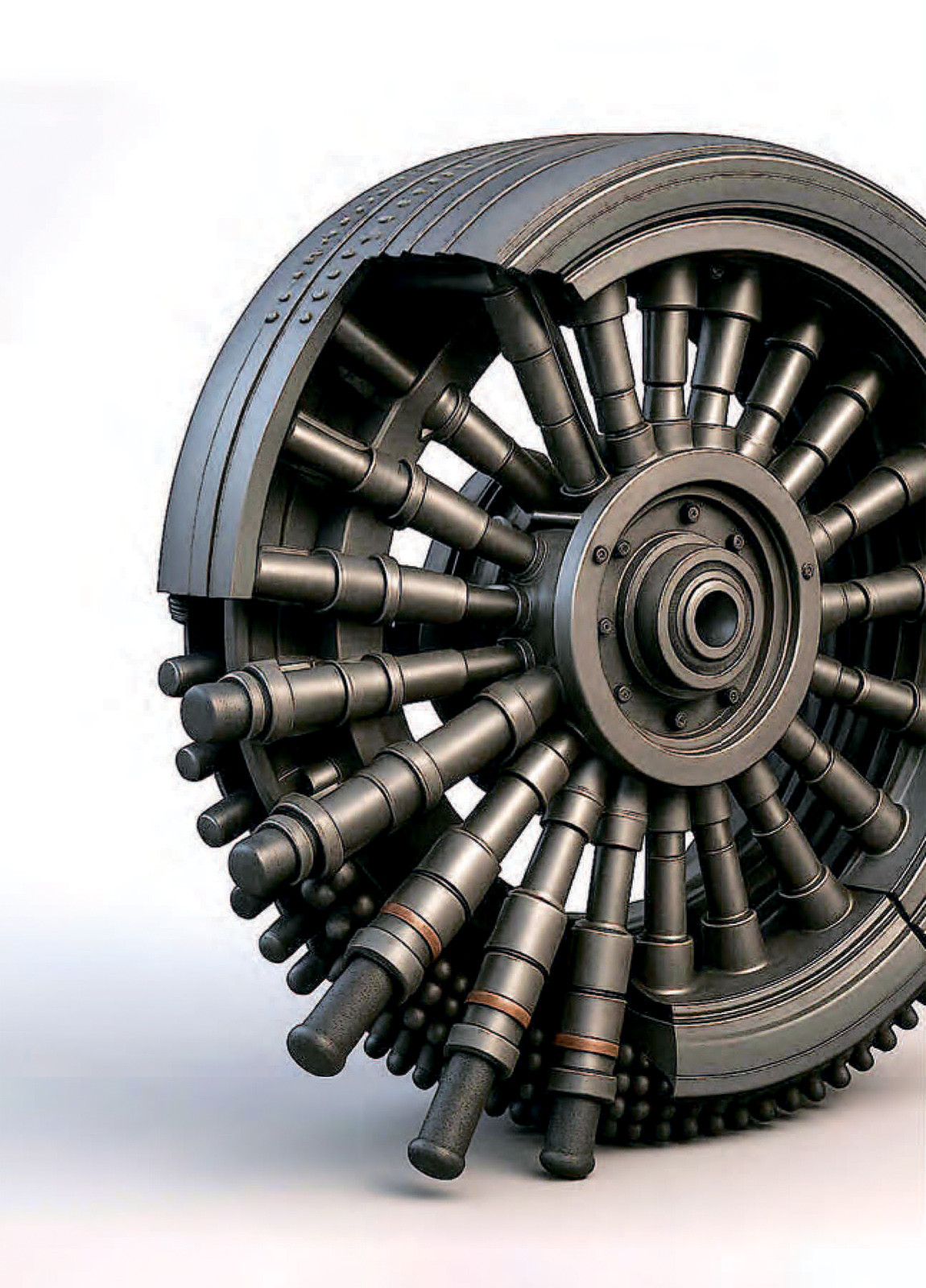 Разработчики американского стартапа Surfaceplan выступили с радикальной концепцией «колеса будущего», предлагая полностью отказаться от передачи вращающего момента от двигателя через трансмиссию на ось. Вместо этого вдоль обода колеса располагается массив небольших актуаторов, которые, выдвигаясь в нужный момент, будут отталкиваться от дороги. По оценке авторов, такая система будет в 2–2,5 раза легче обычной, хотя у экспертов возникают большие сомнения в ее практичности. Хотя бы потому, что поршневые актуаторы станут толкать транспорт не только вперед, но и вверх, приподнимая его над трассой и теряя сцепление с дорожным полотном.