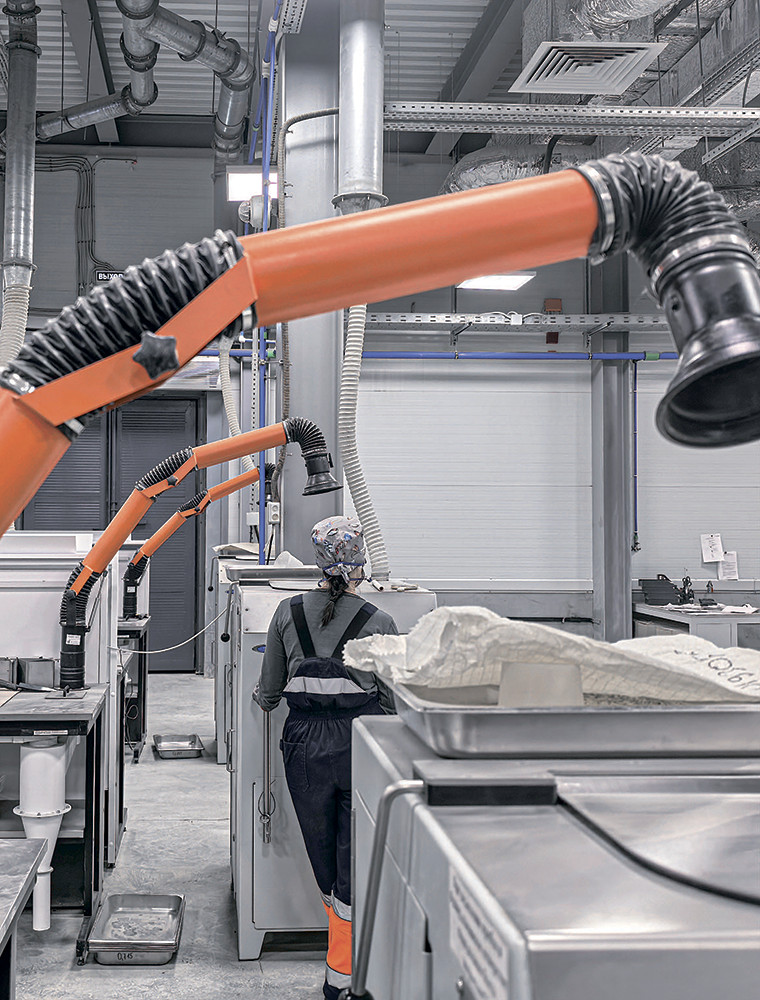 Потолки имеют высоту 4 м не просто так: системы аспирации и вентиляции – жизненно важные коммуникации для лаборатории. Пыль не только опасна для дыхания, но и снижает точность анализа проб.
