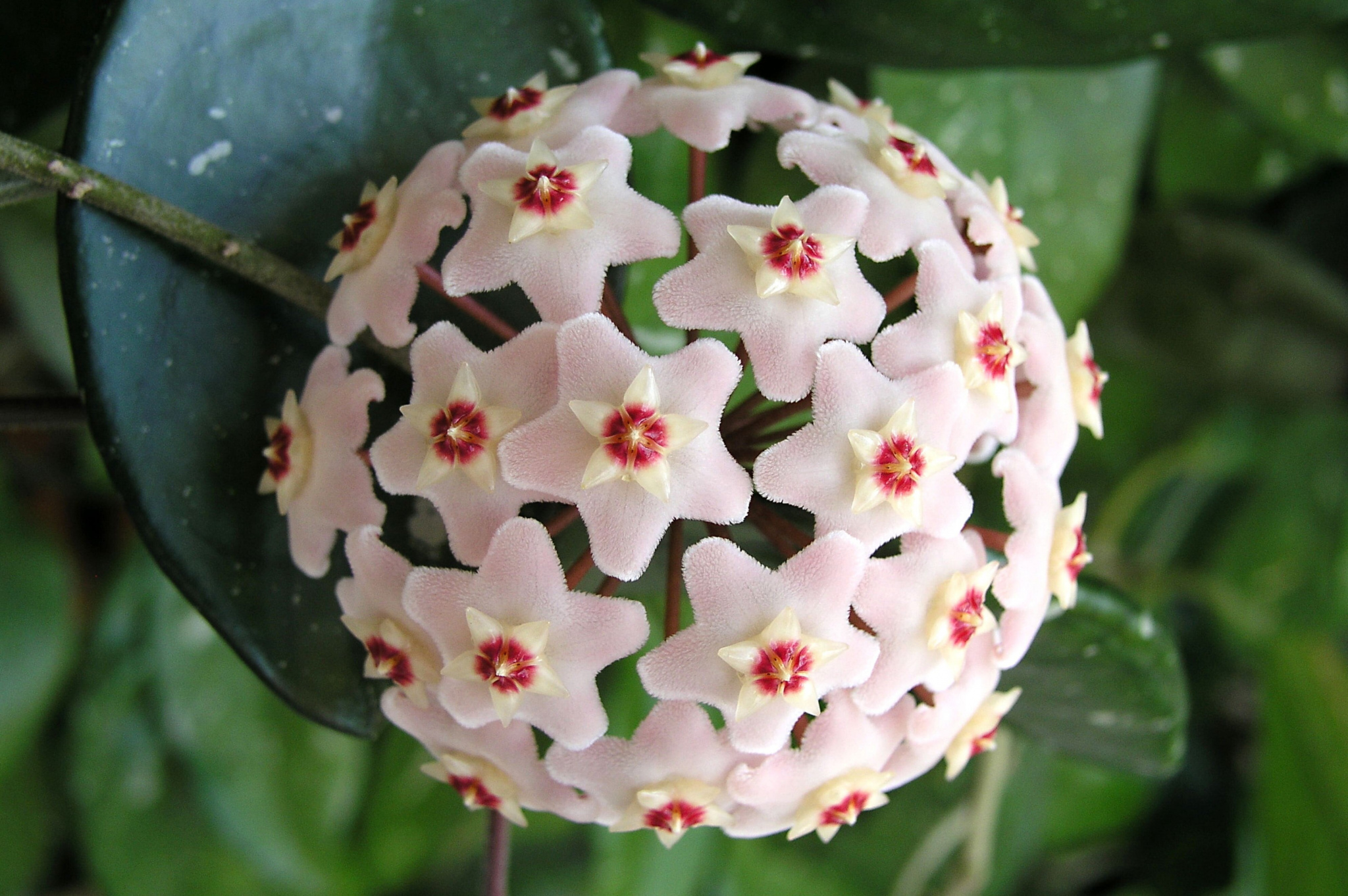Описание. Тропическая лиана с листьями, как будто покрытыми слоем воска. В комнатных условиях достигает 5-6 метров, в хороших условиях может разрастись до сплошной зеленой стены. Цветет с конца мая по начало октября: зонтичное соцветие из цветков, похожих на белые, розовые или коричневые пятиконечные восковые звезды.