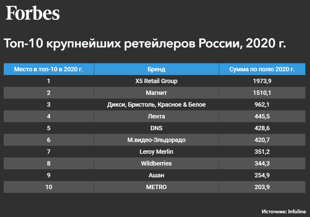 Агентство Infoline назвало 100 крупнейших ретейлеров России. В 2020 году объем их продаж вырос на 15%, превысив 13 трлн рублей. Рекордный рост показали «ВсеИнструменты.ру», новый участник рейтинга — «Почта России».