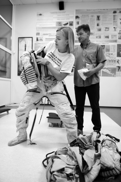 В общем и целом мы ощущаем себя достаточно уверенно. Пока нет никакой паники или слишком сильного волнения. Другой вопрос, что есть такая достаточно сильная усталость от того, что мы (с проектом «Вызов») уже столько времени провели. C 29 марта был конкурс на выбор актрисы (было подано более 3 тыс. анкет), с 24 мая началась непосредственно сама подготовка — все лето без отпуска. И теперь здесь, на Байконуре, мне казалось, что, может быть, у нас получится немножко выдохнуть, но на самом деле здесь огромное количество занятий и тренировок: гипоксические тренировки (кислородное голодание), ортостол (устройство для тренировки«вверх ногами»: кровь приливает к голове и таким образом имитируется ситуация в невесомости), вестибулярное кресло (тренировка вестибулярного аппарата вращением). Плюс мы ездим на примерки ракеты. Вот сегодня занимались как раз нашими киносъемочными укладками, ездили туда. Это очень ранние подъемы, и очень поздно ложимся, потому что у нас до самого вечера занятия.