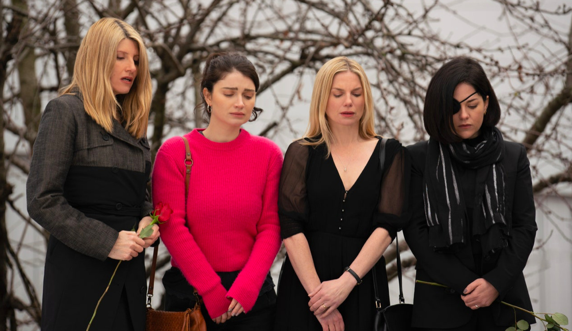 В первых кадрах «Заговора сестер Гарви» (в оригинале, как всегда, точнее — Bad sisters, «плохие сестры») мы знакомимся с главными героями — это пятеро женщин и один the prick (самый литературный перевод с английского, пожалуй, «этот гад»). Из очевидных достоинств последнего — он уже в гробу. Его второе очевидное достоинство в виде посмертной эрекции неловко пытается скрыть подручными предметами печальная вдова Грейс. Параллельно она готовит башню из бутербродов для похорон и льет слезы. Но оплакивает ли она погибшего мужа — или просто режет лук? Этого мы пока не знаем, но зато с первых кадров понимаем: перед нами отличная, черная, беспощадная британская комедия.