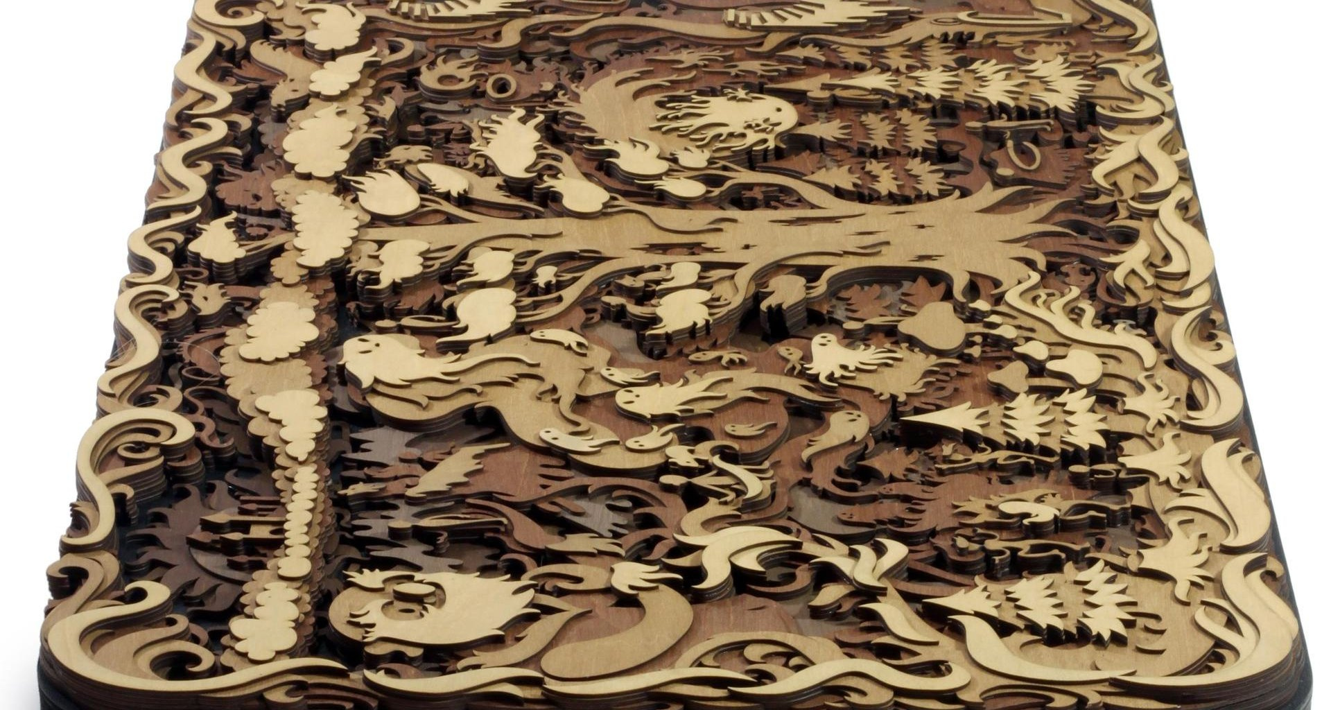 Давным-давно в одной несуществующей стране, где еще не было компьютеров, тысячи мальчишек проводили дни с лобзиком и выжигателем по дереву. Одни по принуждению и неохотно, другие – отдаваясь этому скрупулезному занятию с искренним интересом. Результат, конечно, выходил разный, но ни у кого не получалось создавать фанерные работы так мастерски, как это удается лондонскому художнику Мартину Томски… и его лазерам.