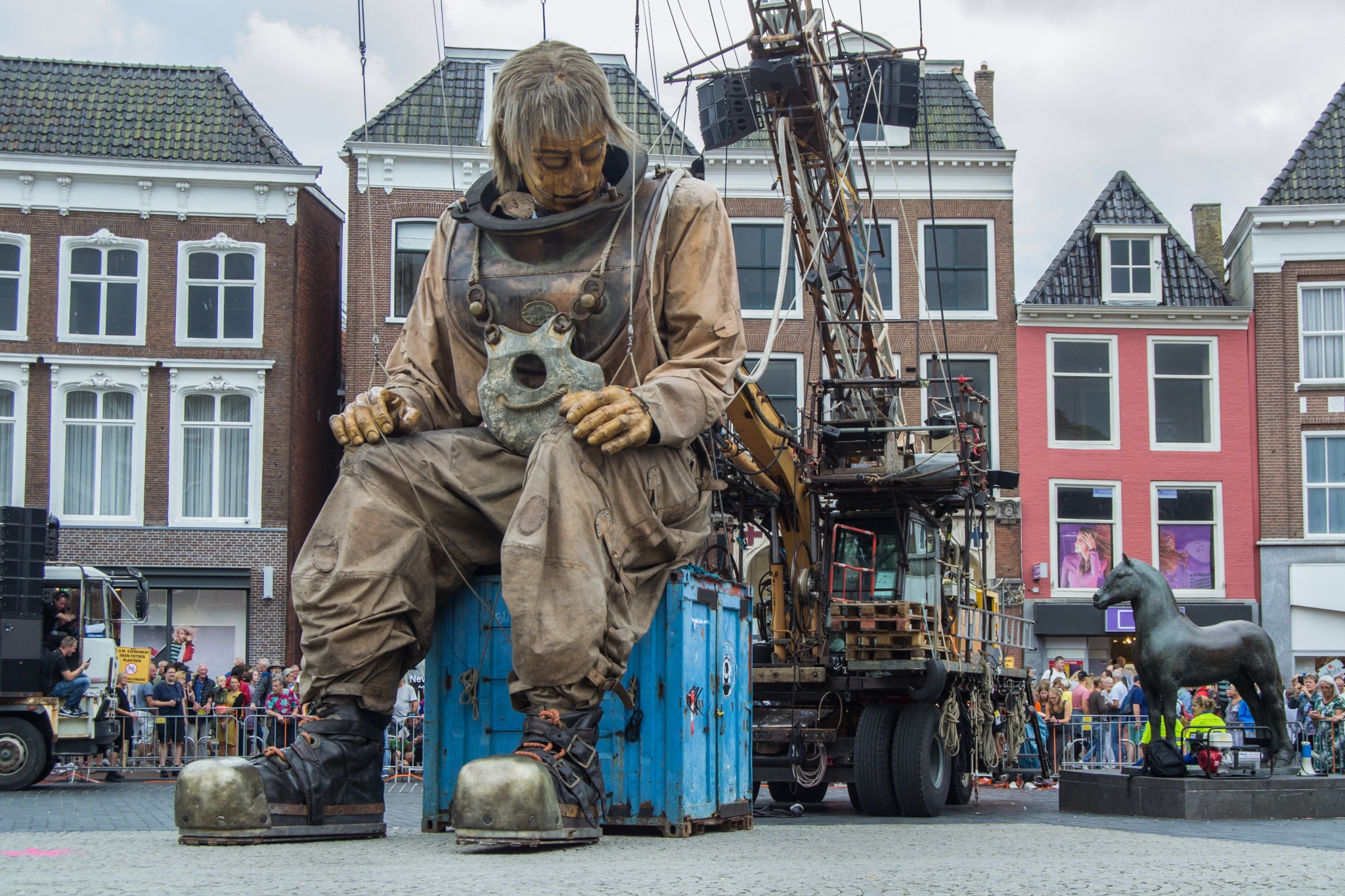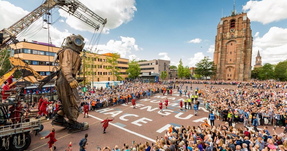Главный герой большинства уличных саг в образе Водолаза дремлет на площади в центре Леувардена (Нидерланды) во время антракта спектакля "Fight against the water" (англ. "Битва со стихией") Небольшой городок в провинции Фрисландия мгновенно привлек к себе внимание общественности во многом благодаря выступлению Royal de Luxe в августе этого года, чья трехдневная программа собрала на улицах полмиллиона зрителей.