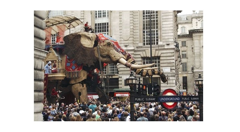 Гигантский механический слон, он же "паровой дом", созданный инженерами театра Royal de Luxe в 2005 году, шагает по улицам Лондона. Вид этой фантастической машины подробно описал в одном из своих произведений земляк Жана-Люка Курку, родоначальник жанра научной фантастики - Жюль Верн. Усовершенствованный прототип, способный перевозить на спине и во чреве до 52 пассажиров, стал символом и одной из главных достопримечательностей Нанта. Совершить получасовую поездку на 12-метровом слоне можно и по сей день в нантском парке развлечений "Остров машин".
