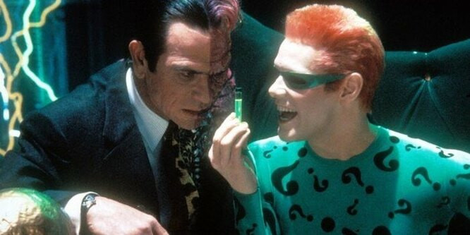 «Бэтмен навсегда» — один из худших фильмов по комиксам. Это был дешевый цирк с нелепыми декорациями, потешным Бэтменом и старательно переигрывающими актерами. Но, как известно, Джим Керри — тот еще мастер переигрывать, он это делает, в отличие от куда более академичных драматических актеров вроде Николь Кидман и Томми Ли Джонса, заметно профессиональнее. Мягко говоря, Джим здесь переиграл и уничтожил. Его сумасшедший Загадочник — стопроцентное попадание в комиксный образ, после чего версия Пола Дано в «Бэтмене» Ривза кажется невыносимо скучной.