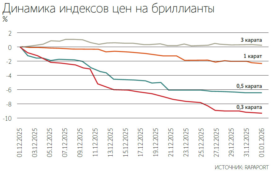 Цены на более крупные камни массой 3 карата в 2025 г. практически не изменились и снизились всего на 0,3% до 18,21 пункта. В декабре индекс цен на них даже вырос на 0,3%.