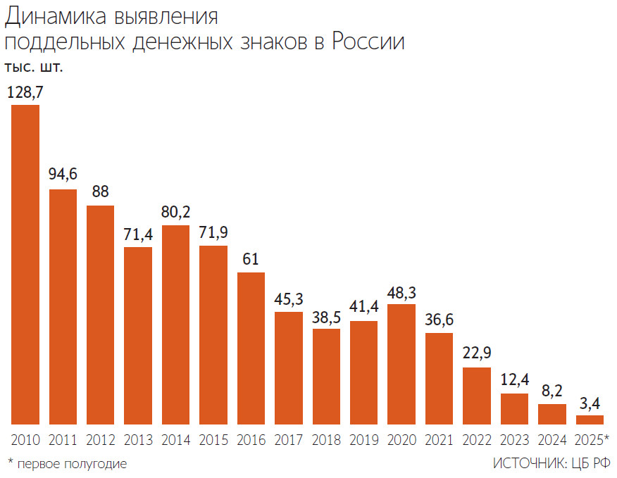 Последние полтора года количество обнаруженных поддельных рублевых банкнот держится на исторически минимальных значениях: если в 2010 г. ежемесячно выявлялось в среднем около 11 000 подделок, то в 2024 г. и первом полугодии 2025 г. их количество ни разу не превысило даже 800 шт. в месяц. Это следует из статистики Банка России, которую он ведет с 2010 г.