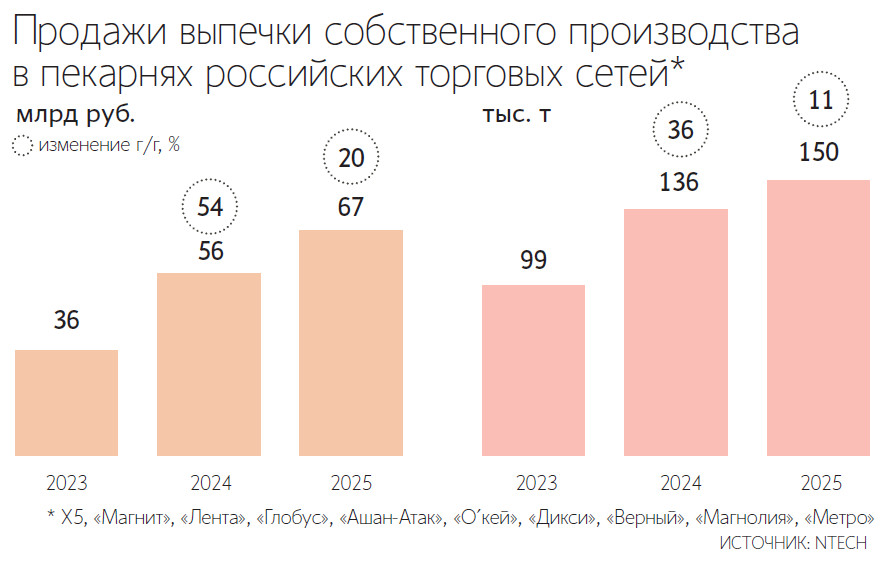 В натуральном выражении этот показатель по итогам 2025 г. увеличился год к году на 11% до 150 000 т, тогда как в 2024 г. динамика составляла 36%, говорит представитель NTech. В денежном выражении реализация продукции пекарен, по его словам, достигли 67 млрд руб., увеличившись на 20% против 54% годом ранее. В выборке учитывались данные X5, «Магнита», «Ленты», «Глобуса», «Ашана», «О’кей», «Дикси», «Верного», «Магнолии» и Metro. Сама категория включала в себя выпечку собственного производства данных сетей.