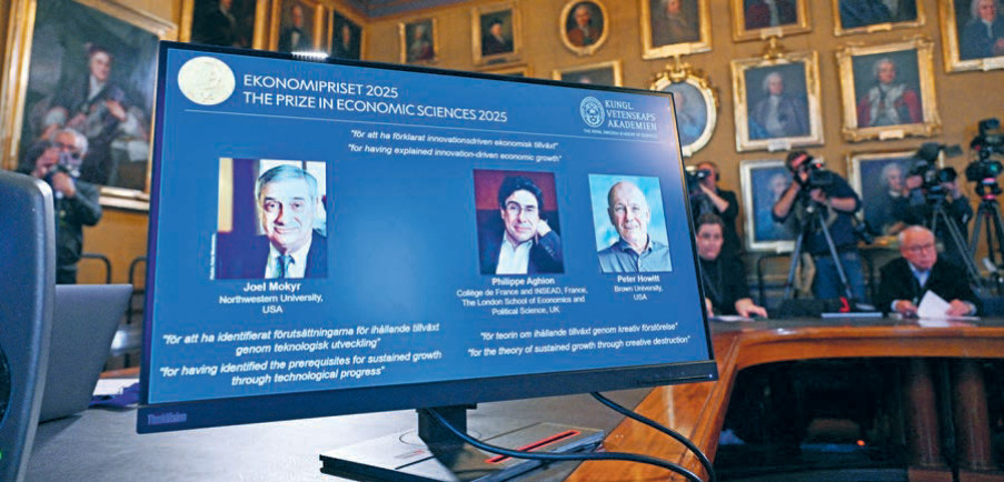 Королевская академия наук Швеции присудила Нобелевскую премию по экономике троим ученым за объяснение причин устойчивого экономического роста. Одна половина награды досталась Джоэлю Мокиру с формулировкой «за определение предпосылок устойчивого роста посредством технологического прогресса». Вторую же половину разделили между собой ученые Филипп Агьон и Питер Ховитт с формулировкой «за теорию устойчивого роста посредством творческого разрушения».