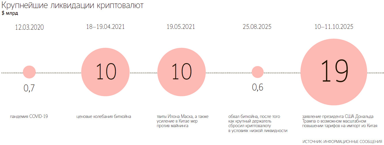 Вечером 10 октября по московскому времени рынок криптовалют пережил крупнейшую ликвидацию позиций – на $19 млрд, по данным CoinGlass, что в 20 раз превысило масштаб «коронавирусного» краха 2020 г. Из этой суммы около $10 млрд пришлось на биржу Hyperliquid. По оценкам БКС, капитализация криптовалют в ночь с пятницы на субботу упала на 20,8% ($850 млрд).