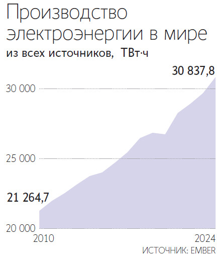 Крупнейший производитель и потребитель электроэнергии в мире – Китай. По данным Государственного статистического управления КНР, в 2024 г. страна увеличила выработку электроэнергии на 5% до 9,4 трлн кВт ч. При этом, по данным аналитического центра Ember, которые в абсолютном выражении несколько отличаются от данных китайской статистики, доля угля в производстве электроэнергии в Китае в прошлом году составляет почти 60% – 5,8 трлн из 10,1 трлн кВт ч. По сравнению с показателем 2023 г. выработка угольных электростанций выросла на 2%.