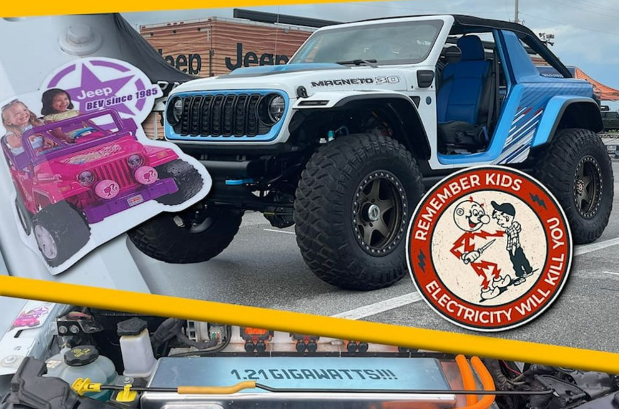 Magneto 3.0 – третья версия концепта электрического Wrangler, который впервые показали в 2021 году. Только теперь его единственный электродвигатель обладает значительно большей мощностью. В общем, «Магнето» является превью того, каким будет электрический Jeep Wrangler.