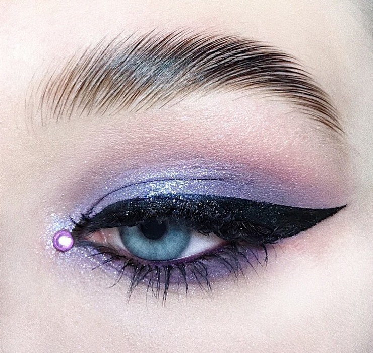 Влажный гелевый глиттер можно наносить поверх гелевой подводки или широких стрелок, нарисованных при помощи карандаша. Добавление блеска в такой макияж век, делает взгляд более драматичным и выразительным.