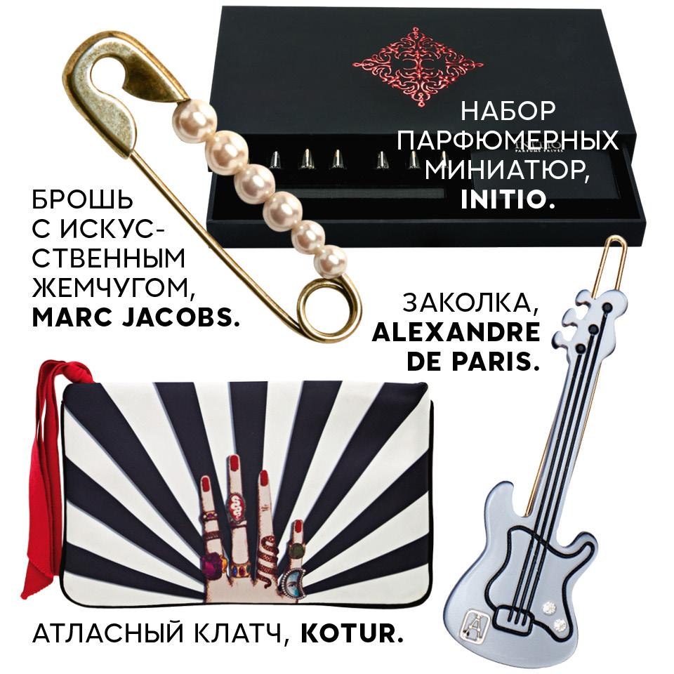 Клатч, духи в тревел-флаконе, брошь и заколка — подарки при покупках.