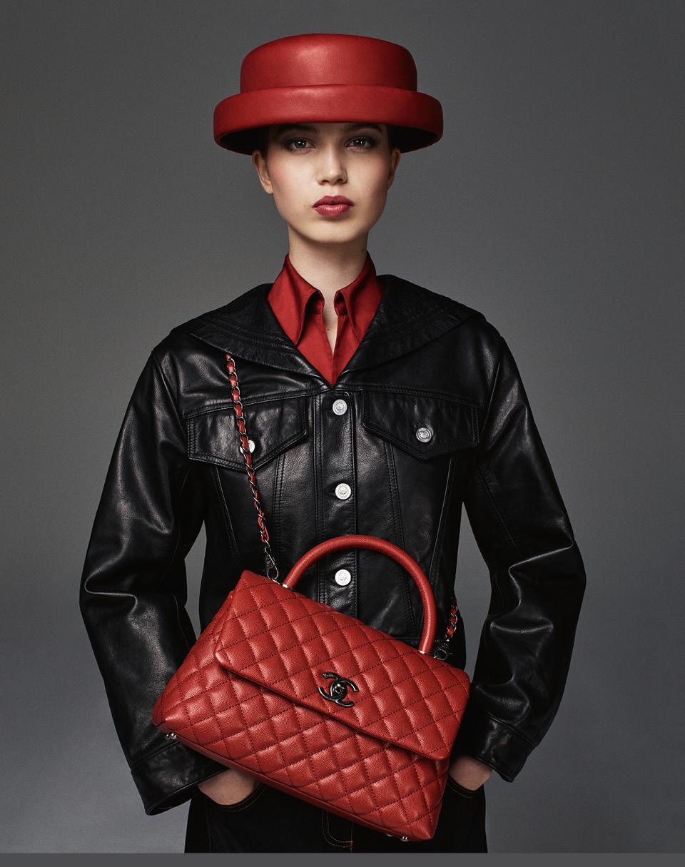 Кожаный жакет, около 110 000 руб., хлопковые брюки, 20 000 руб., все Kenzo; шелковая блузка, 54 000 руб., Tome; кожаные сумка и шляпа, все Chanel.Золото и гобелен