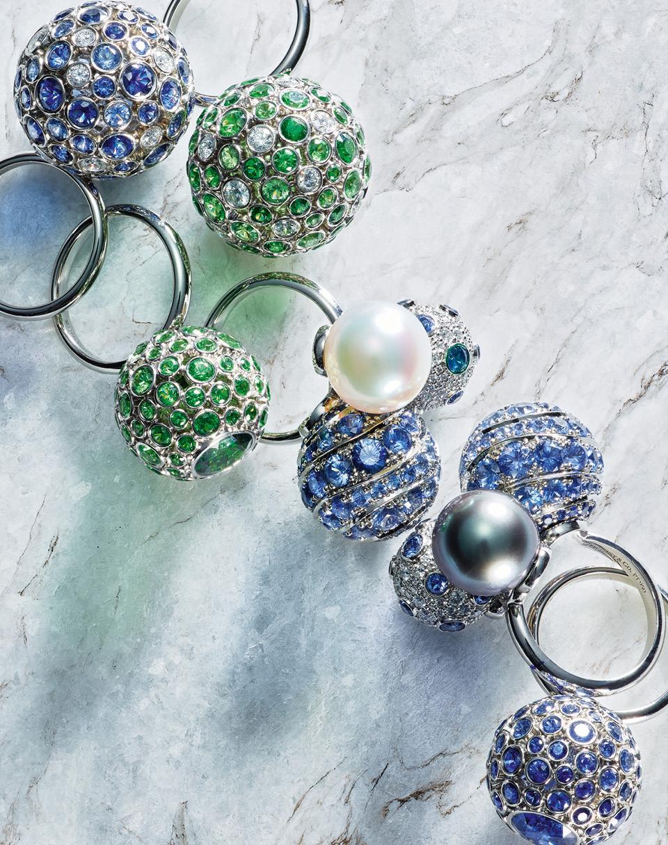 Директор по дизайну Tiffany Франческа Амфитеатроф обожает смотреть на океан. Так родилась ее новая коллекция «Шедевры», куда вошли кольца-шары и подвески с цаворитами, голубыми и розовыми сапфирами, бриллиантами и цветными жемчужинами южных морей. Камни разных цветов и размеров подобраны так, чтобы создать плавные переходы оттенков морской волны и игру бликов. Собственно, того же эффекта сто лет назад и добивался в своих эмалях и витражах первый дизайнер марки Луис Комфорт Тиффани. Теперь его работы хранятся в нью-йоркском музее Метрополитен.