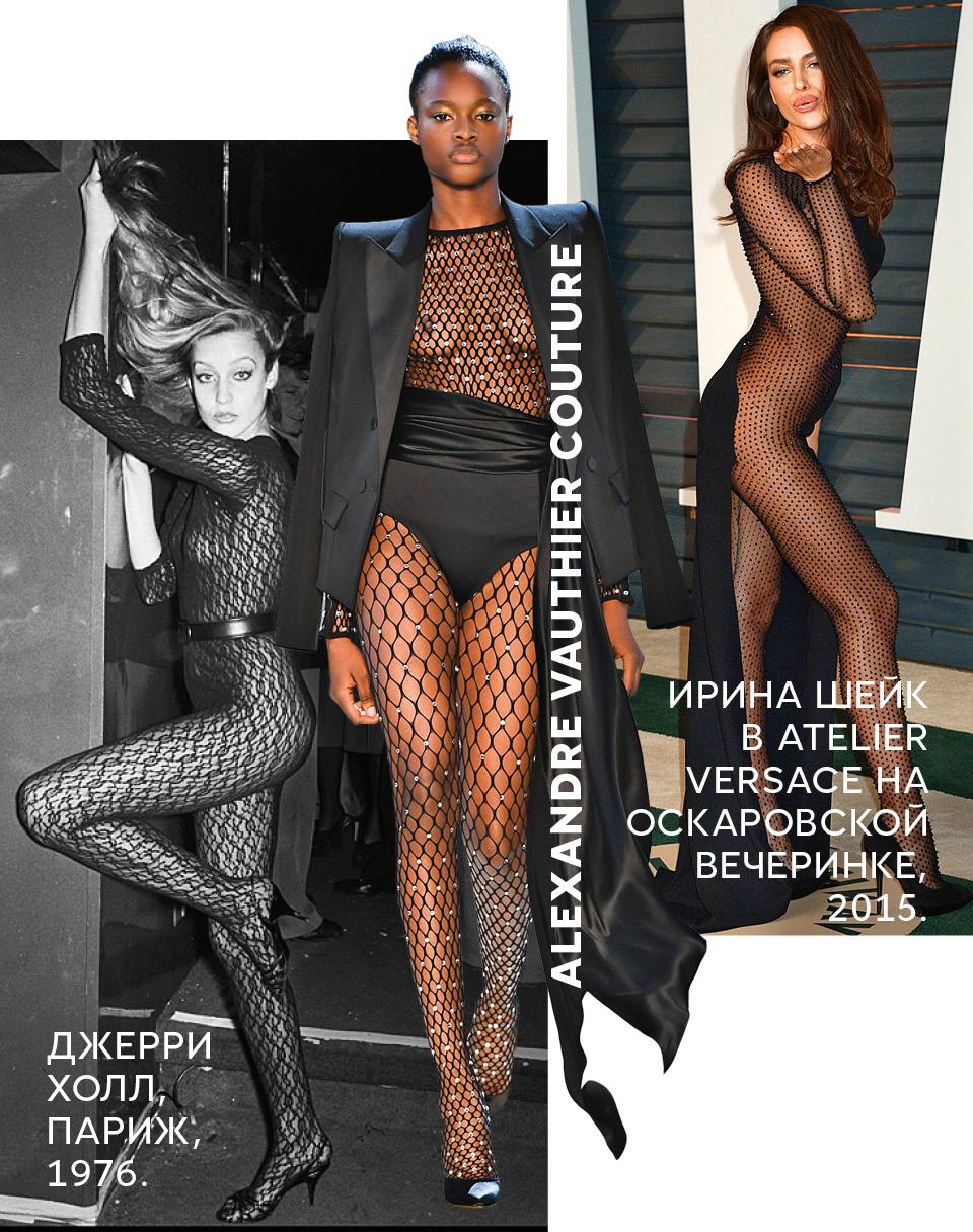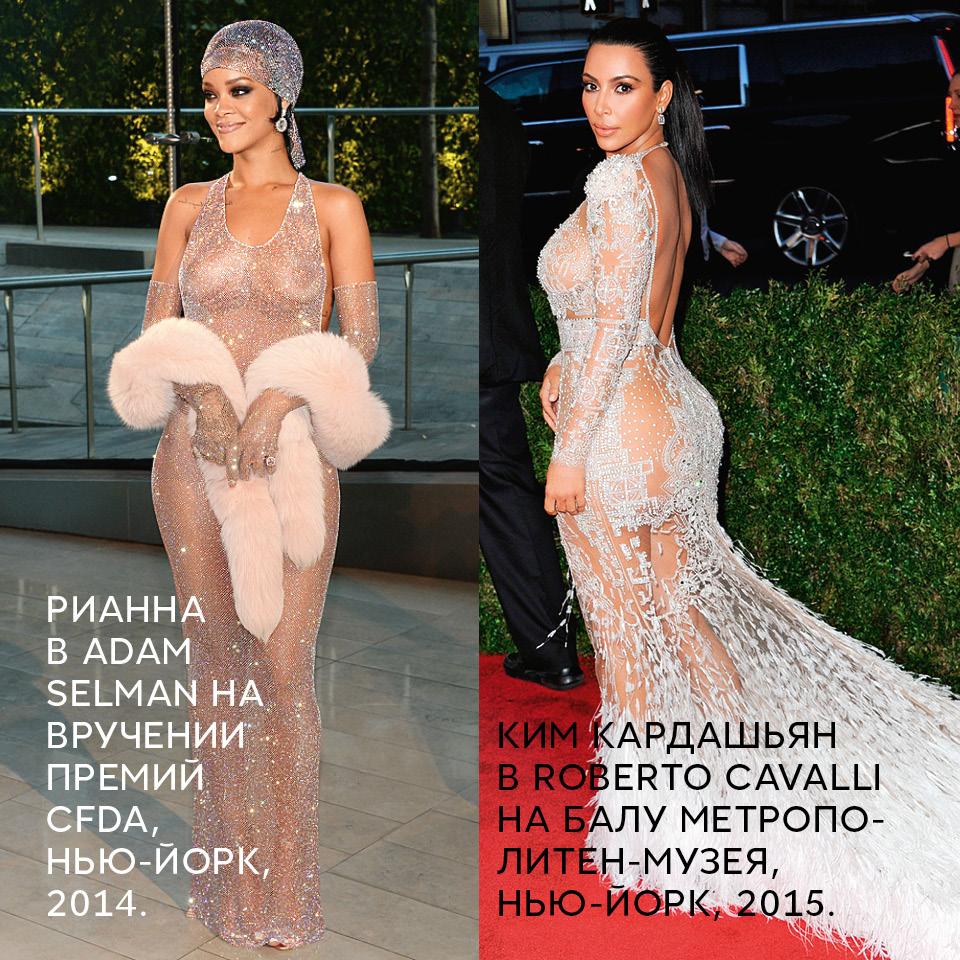 В последнее время мы привыкли к наготе куда более публичной, чем подиум. Дженнифер Лопес в «голом» платье Versace, Бейонсе в прозрачном платье Givenchy на балу в Метрополитен-музее, из относительно недавно примкнувших — Майли Сайрус топлес в Tom Ford, верх которого состоит из двух не слишком широких бретелей, ну и, разумеется, главное тело нашего времени Ким Кардашьян — в абсолютно прозрачных кружевах на всех этапах своей жизни, в том числе и беременная.