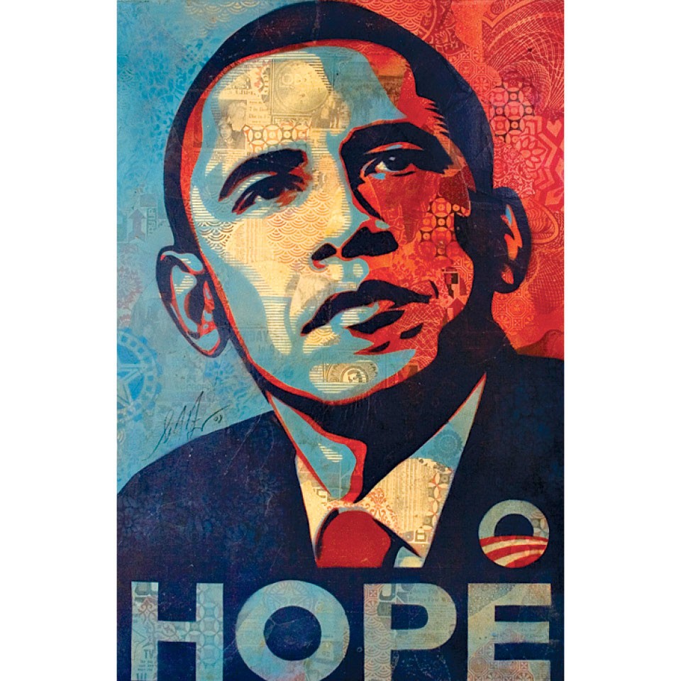 На самом деле и то и другое. В то время как Шепард Фейри «метил» широкие бульвары Лос-Анджелеса, Бэнкси, чья выставка этим летом тоже приехала в Москву, бродил по узким извилистым улицам Лондона. Изображения, нарисованные на глазах у ничего не подозревающих прохожих в общественных местах, стали полной противоположностью атакующей нас со всех сторон рекламы. Плакат Фейри, сделанный во время предвыборной кампании Барака Обамы в 2008 году, с портретом президента и надписью Hope («Надежда») висел повсюду и был признан культовым. За следующие пять лет Фейри превратился в воплощение юного бунтарского вызова, используя искусство как способ воздействия, а общественные места — как трибуну для политических заявлений. Его десять раз арестовывали, в том числе и с применением силы.