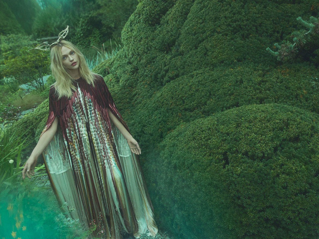 Саша Пивоварова в шелковых накидках и платьях с цветочным принтом играет сказочную героиню в затерянном саду и рассказывает Vogue, как совместить моду и искусство