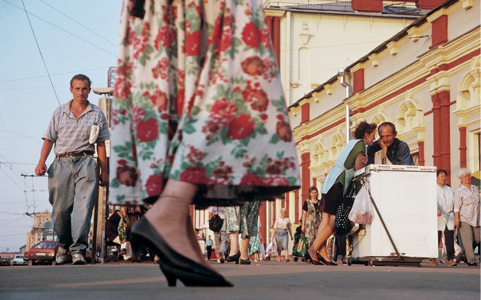 «Это фэшн-съемка глазами журналиста, — куратор выставки Нина Гомиашвили поет дифирамбы итальянцу Фердинандо Шанне. — Ты видишь этих моделей-итальянок, эти шубы, это лето в Ленинграде и понимаешь, что перед тобой съемка для журнала (а на самом деле для рекламы итальянской шубной фабрики), но в ней столько жизни, секса, движения, что кажется, будто никакой постановки и не было. И еще эти зонтики голубые, эта красная синтетическая, как и положено 1980‑м, детская коляска на фоне храма — в общем, невозможно не влюбиться, хочется распечатать все это и повесить на стену. И у Мартина Парра, который в конце 2000‑х снимал Галю Смирнскую на сочинском пляже на фоне гальки и загорающих бабушек, также получаются фотографии невероятной наполненности. Это не постановка. Парр просто останавливается, и мир перед ним начинает кружиться удивительным образом. Они все волшебники, конечно».
