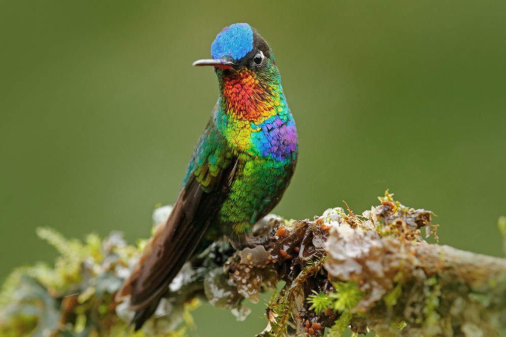 Все колибри выглядят как ювелирные изделия, и трудно сказать, кто из них ярче. Наш выбор пал на огненногорлого колибри – обитателя горных тропических лесов Коста-Рики и западной Панамы. Птица живет на высотах 1600–200 м (после размножения часть особей спускается чуть ниже), кормится, как и положено колибри, нектаром цветов. Самцы и самки окрашены одинаково. Вид редкий, с ограниченным ареалом, но специалисты по охране природы считают, что его существованию ничего не угрожает.
