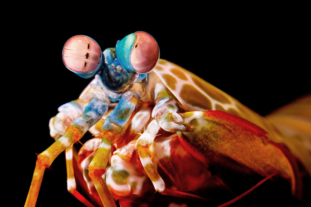 Основной тон его окраски – зеленый, но в ярком свете сверкает и переливается всеми цветами радуги. Вероятно, в глазах сородичей рак-богомол выглядит еще прекраснее – у него 16 типов цветовых рецепторов (для сравнения: у человека только три). Поэтому рак способен воспринимать инфракрасные и ультрафиолетовые волны, а также поляризованный свет. Непонятно, правда, зачем все это великолепие засадному хищнику, который почти все время скрыт в норке.