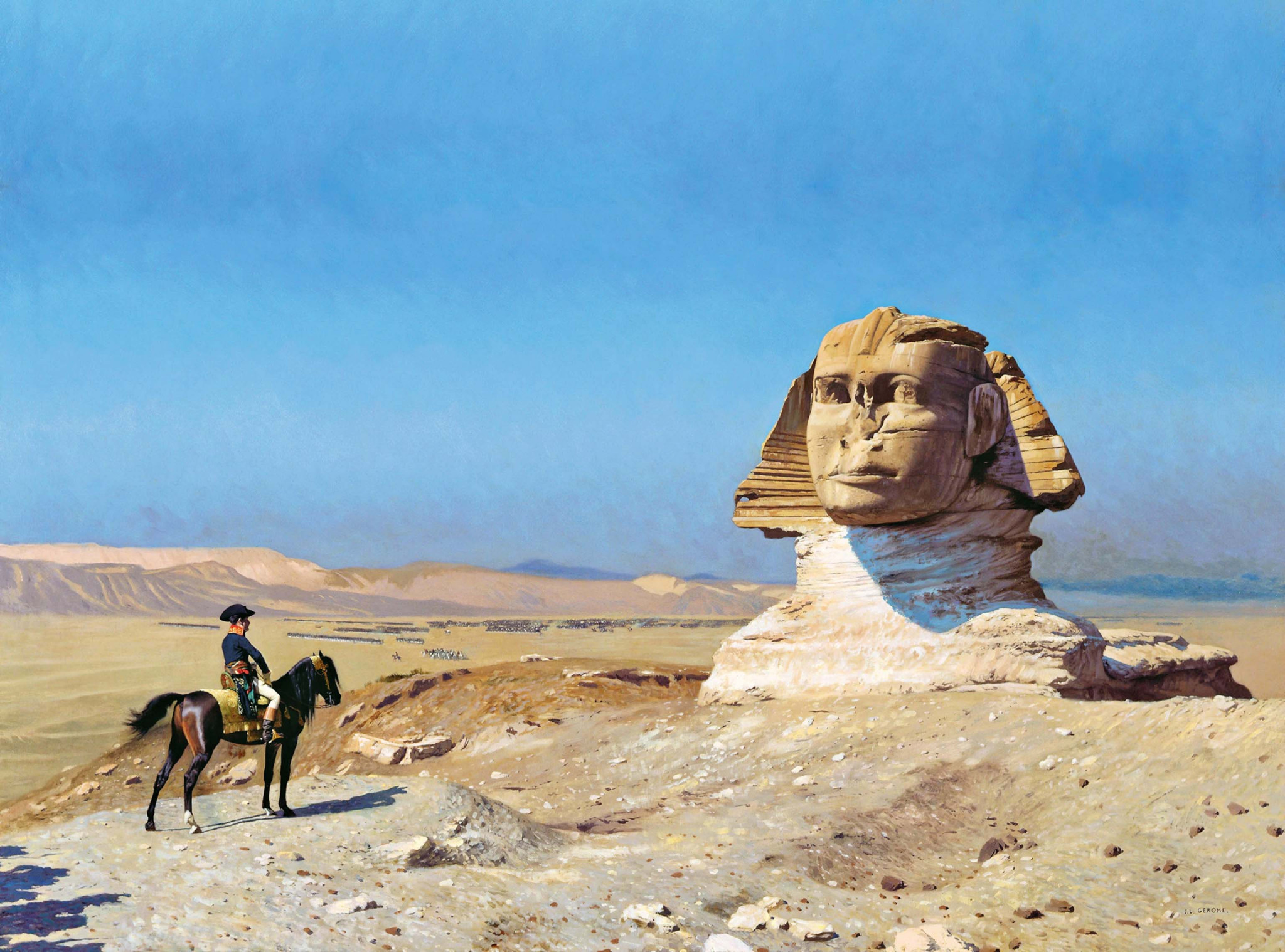 Картину, изображающую Наполеона Бонапарта перед Большим Сфинксом в Гизе, Жан-Леон Жером выставил на парижском Салоне под вторым названием – «Эдип». Два направления творчества художника – сюжеты Древнего мира, за которые его школу прозвали неогреческой, и увлечение более близкой ему по времени восточной экзотикой – сошлись на этом полотне в одной точке.