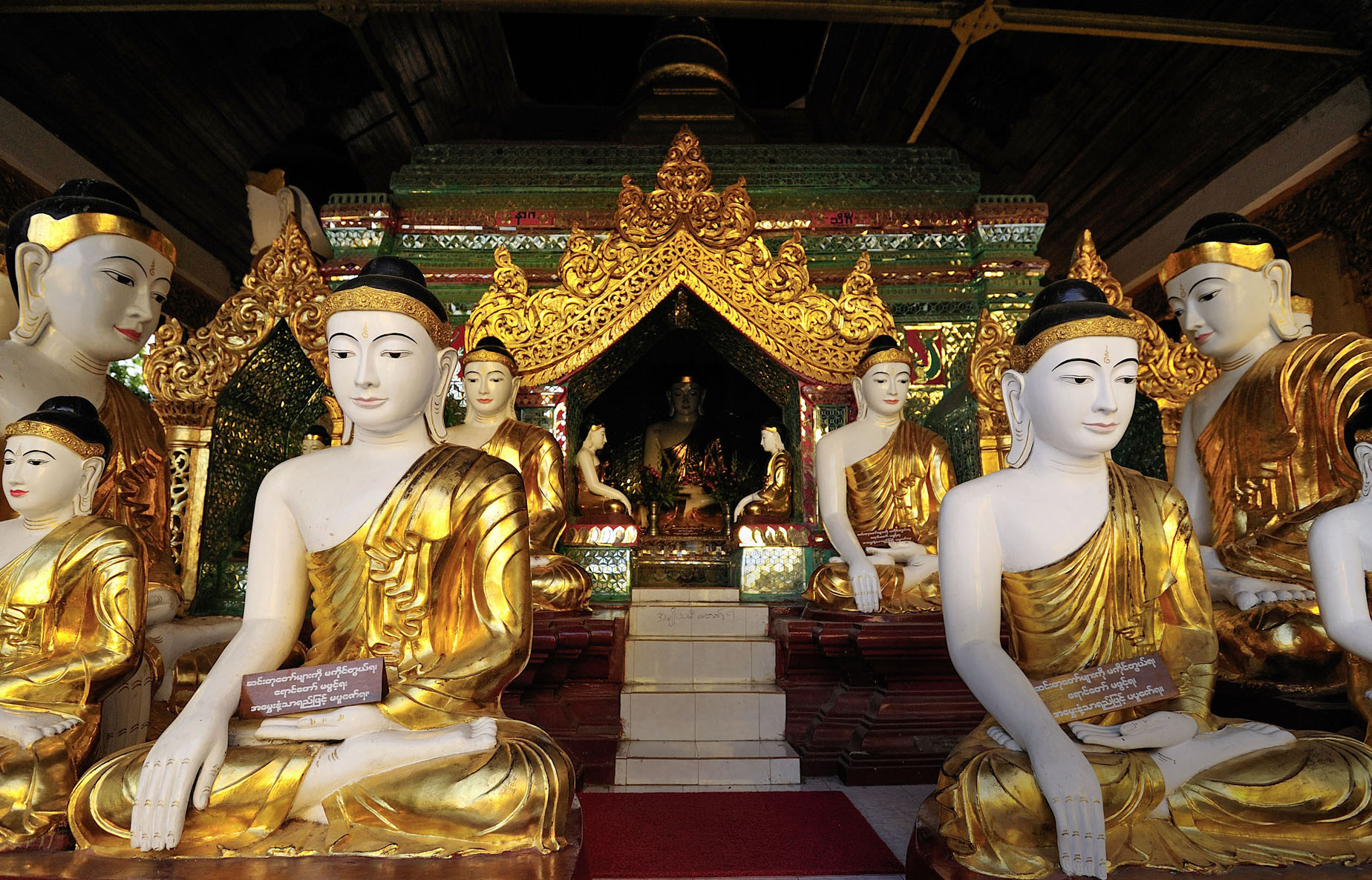 Шведагон производит неизгладимое впечатление. Огромная круглая золотая ступа окружена храмами, которые сооружались на протяжении столетий. Все они роскошно украшены, ведь правители и знать, спонсировавшие строительство, старались перещеголять друг друга. Где-то колонны выложены градацией жадеита, от светлого к густо-зеленому, где-то украшены мозаикой из зеркал, где-то стуковым декором – из смеси наподобие гипса, где-то причудливой резьбой по дереву пан-бу. Многочисленные статуи Будды сидят, стоят, касаются пальцами земли или держат их сложенными в мудры. По периметру основания ступы расположены алтари, посвященные дням недели, у буддистов их восемь: среда считается за два дня, для симметрии. Недельные алтари разделены четырьмя более крупными пагодами.